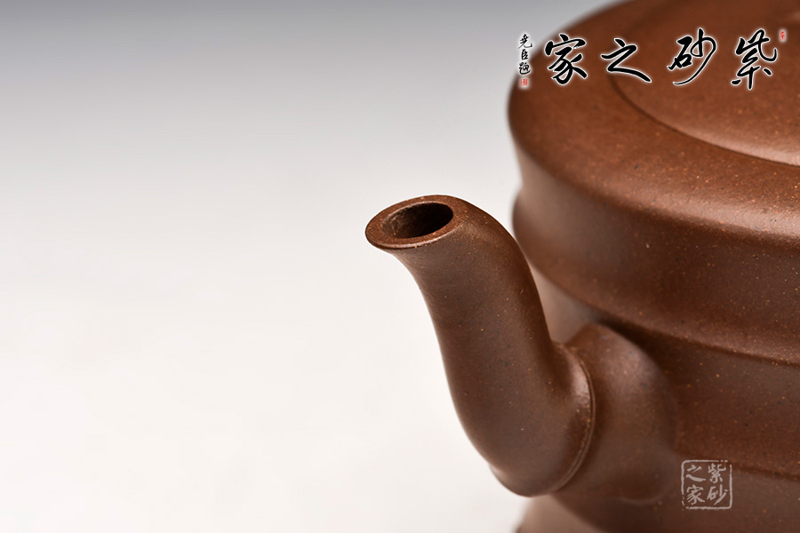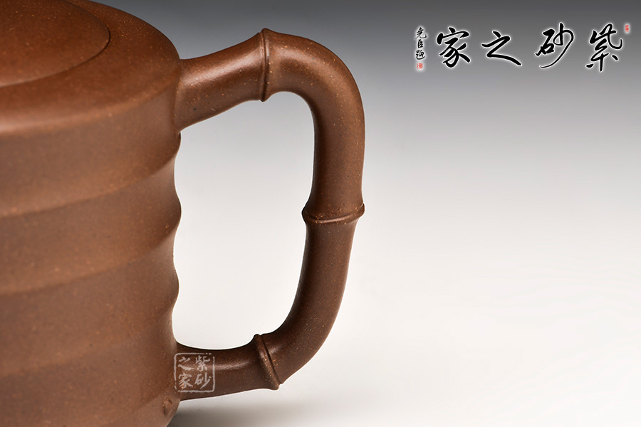 所謂“節(jié)節(jié)高升”,有事業(yè)順利、萬事如意的美好寓意。此壺造型十分有靈氣,壺身略高,飽滿而圓潤,線條流暢。壺身四圈環(huán)腰,呈現(xiàn)一梯一梯的階梯狀,各段之間過度自然,精工修整,層層而上,正有節(jié)節(jié)高升之意。