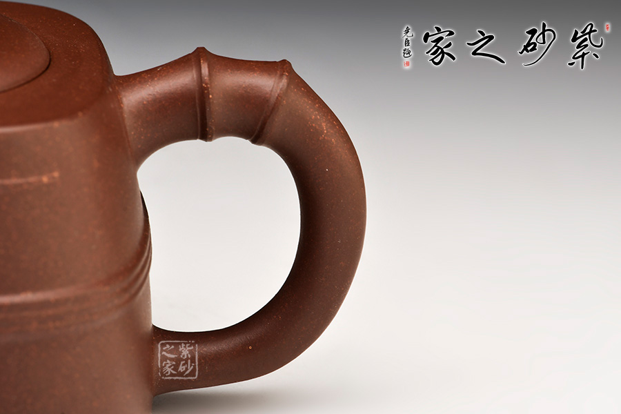 壺之流、把、鈕竹節(jié)彎折而成,師法自然而不拘泥于人工描摹,橋鈕貫通左右,貼花立體而生動(dòng),端的流暢自如。