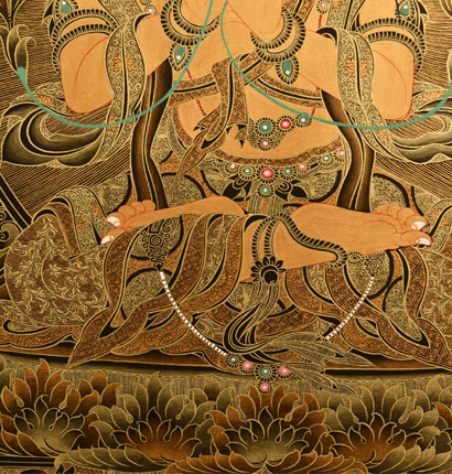 | 唐卡是歷史的瑰寶,現(xiàn)已被例入國家非物質(zhì)文化遺產(chǎn)名錄,得到了高度的重視和保護(hù)。同時(shí)由于顏料的珍稀、繪制周期長、工藝復(fù)雜大大增強(qiáng)了其珍藏價(jià)值。一幅好的作品可遇不可求,近年來唐卡已成為收藏界炙手可熱的藏品。 | 唐卡的形式便于攜帶,其內(nèi)容體現(xiàn)了藏傳佛教的莊重、神圣、華貴,被稱為“移動(dòng)的佛像”。同時(shí)也是修行者積累善業(yè),追尋心靈的平靜與安寧的一個(gè)過程。 | 唐卡的內(nèi)容包羅萬象,它以圖像的方式承載著藏族文化精髓,是藏族智慧的結(jié)晶,廣泛傳播了藏地的文化、歷史和宗教理論。 | 唐卡絢麗的色彩、流暢的線條、嚴(yán)謹(jǐn)?shù)慕Y(jié)構(gòu),都充滿著濃郁的高原和游牧民族風(fēng)情,無疑是難得的藝術(shù)珍品。值得一提的是唐卡繪制顏料全部為天然礦物顏料,畫面效果艷麗,可以保存千年而不變色。 |