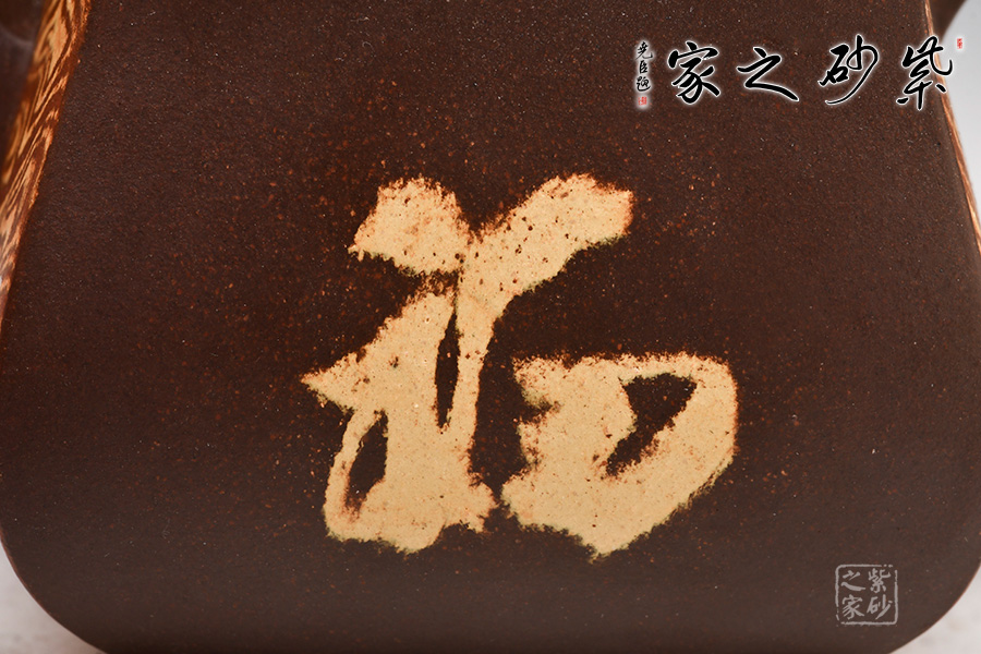 此壺非常有特色,壺身為絞泥花紋,做大理石紋樣,正反面作“福、發(fā)”二字。