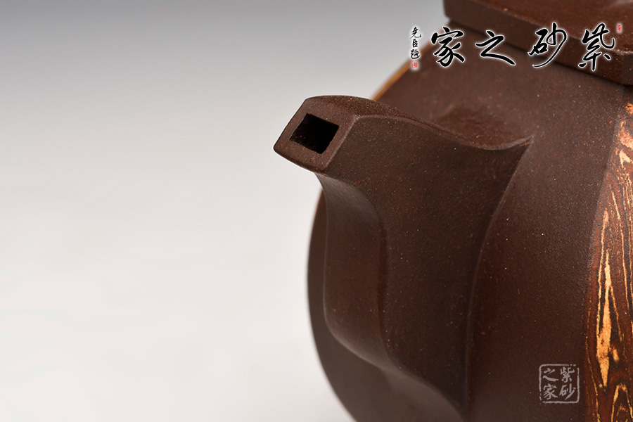 壺足、壺腹、壺頸、壺蓋、壺鈕,乃至壺流與壺把兼以四方側(cè)角構(gòu)成,實為八方。壺鈕至圈足自上而下八根線條將壺身分為八大塊面,壺蓋、壺流、壺把與圈足順其巧妙延續(xù),形成即協(xié)調(diào)又穩(wěn)重之態(tài)。
