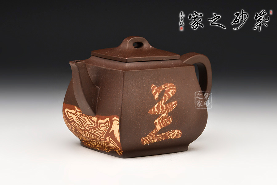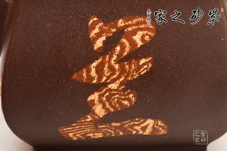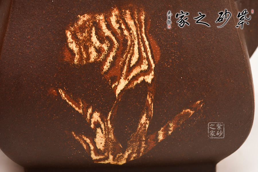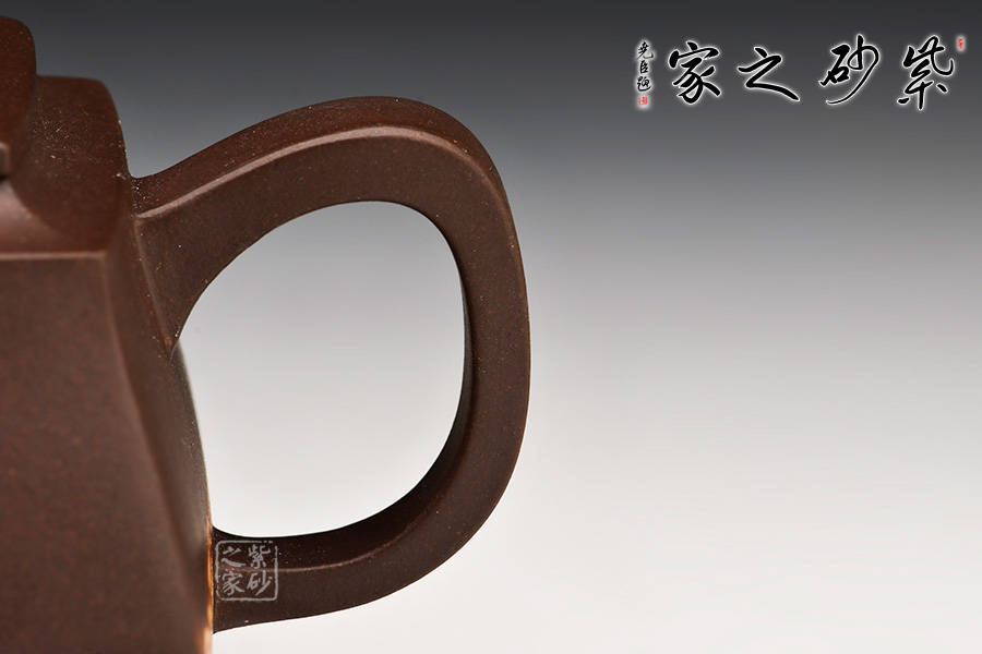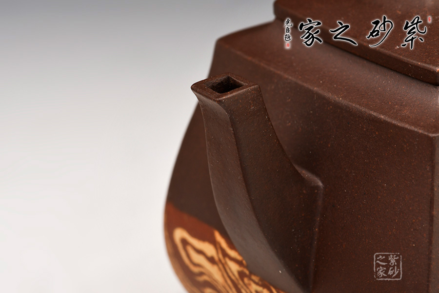 器型上扁而不塌,暗蘊(yùn)力道,反而極覺(jué)挺拔之氣!四方體,四方底,四方蓋,四方流口,方圓并濟(jì)、剛?cè)崛谇ⅲ〉胶锰幍卣宫F(xiàn)了一把方器的挺拔剛毅,亦有兒女柔情。