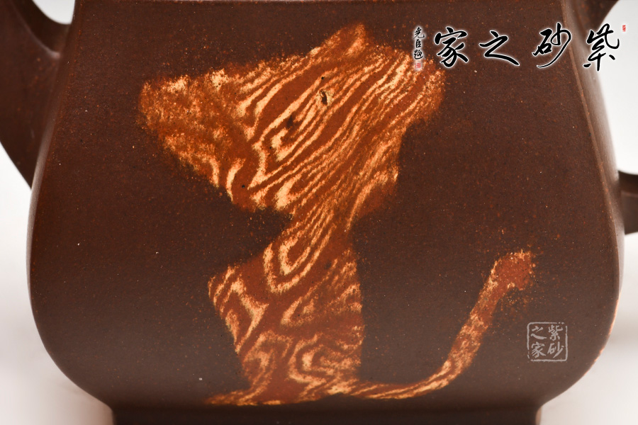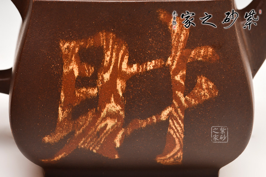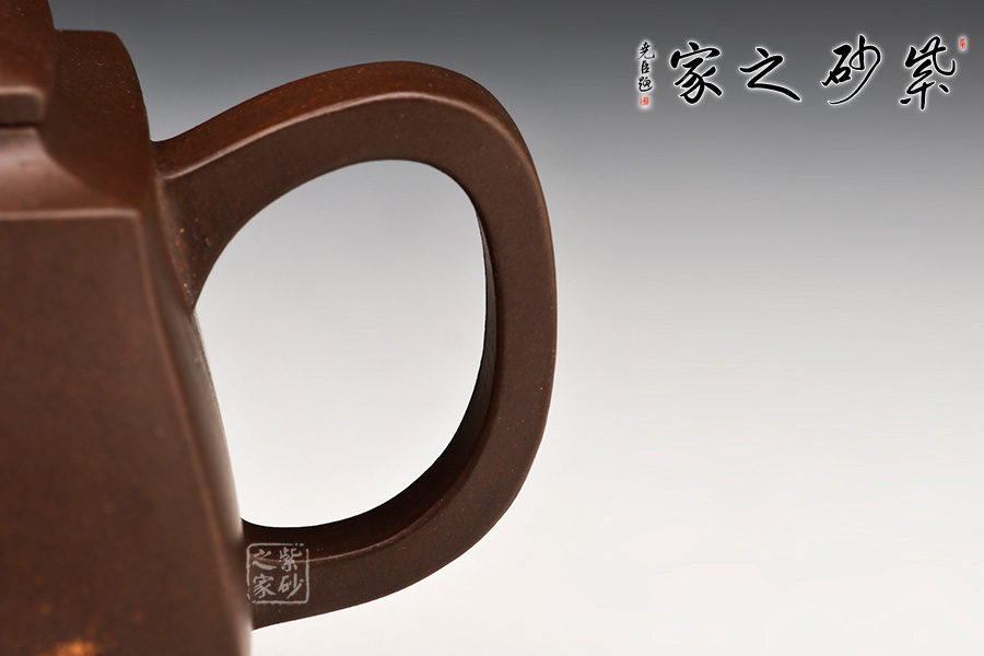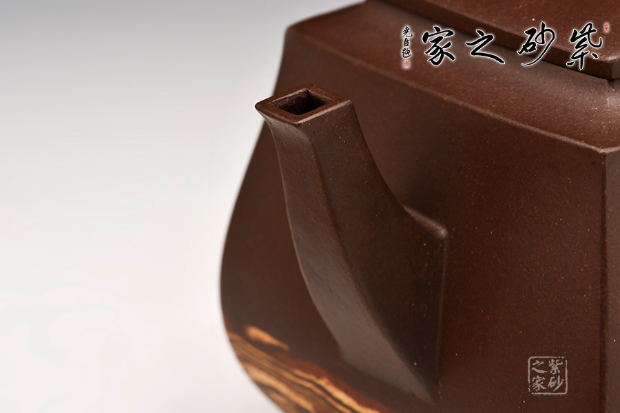 器型上扁而不塌,暗蘊(yùn)力道,反而極覺挺拔之氣!四方體,四方底,四方蓋,四方流口,方圓并濟(jì)、剛?cè)崛谇ⅲ〉胶锰幍卣宫F(xiàn)了一把方器的挺拔剛毅,亦有兒女柔情。