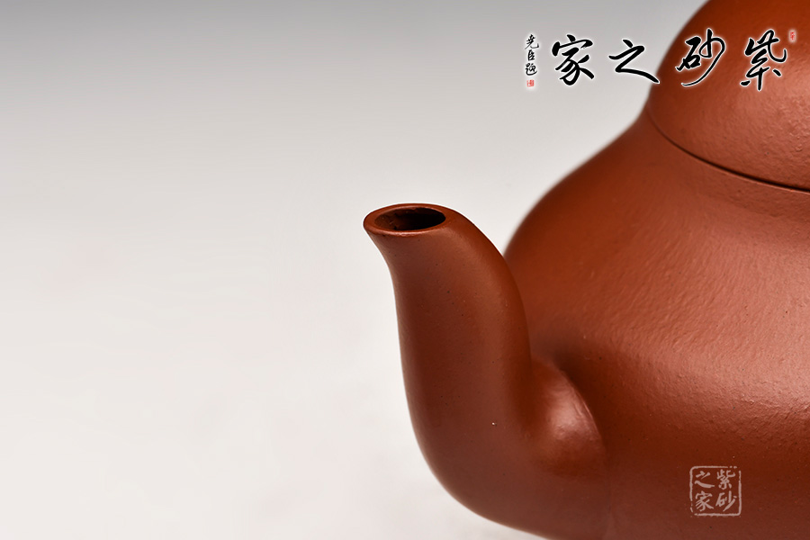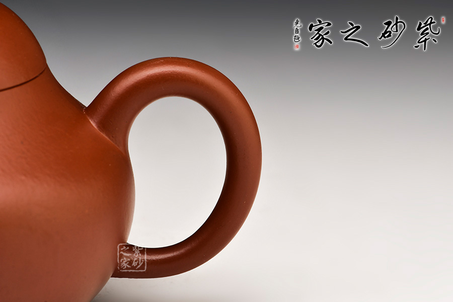 此壺全是由弧線,圓線,曲線組成,造型端莊秀美,特別壺嘴和壺體相連的兩條弧線,流暢生動,把上的把手部位,溫潤舒適,這樣的壺捧在手掌,處處讓你可以感受紫砂的溫馨可人。