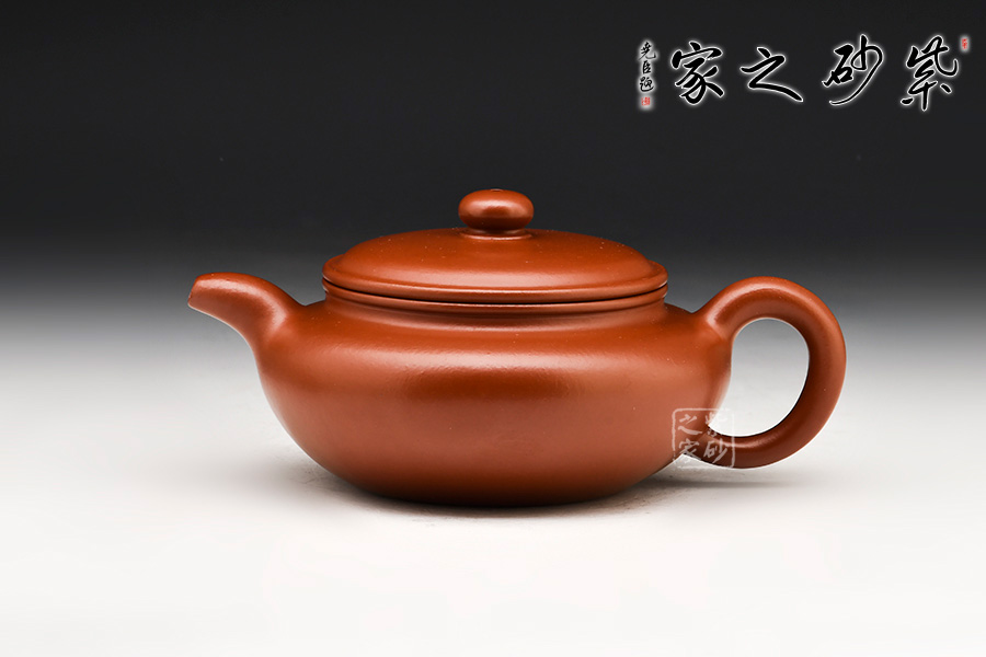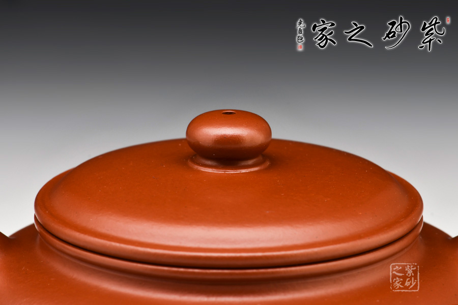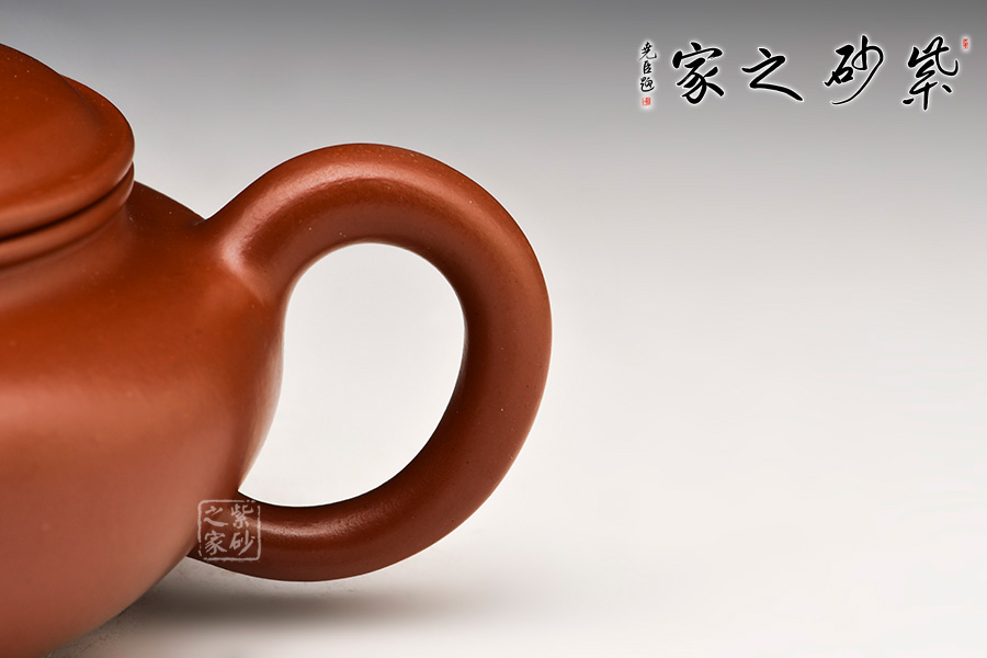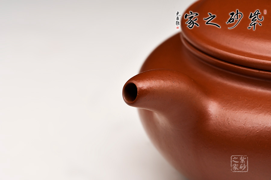 此壺精選珍藏原礦朱泥,成色喜慶,養(yǎng)成嬌艷。造型端莊古樸,又頗含動感。蓋與壺身渾成一體,流向上微屈力感十足,把則呈大橢圓形,母子線口蓋吻合嚴密,鈕扁圓對應腹部,嘴、把勻稱,特別是蓋面制作別致,整體造型弧線優(yōu)美、線條流暢,視覺感也極為舒適,整把壺穩(wěn)健豐潤。