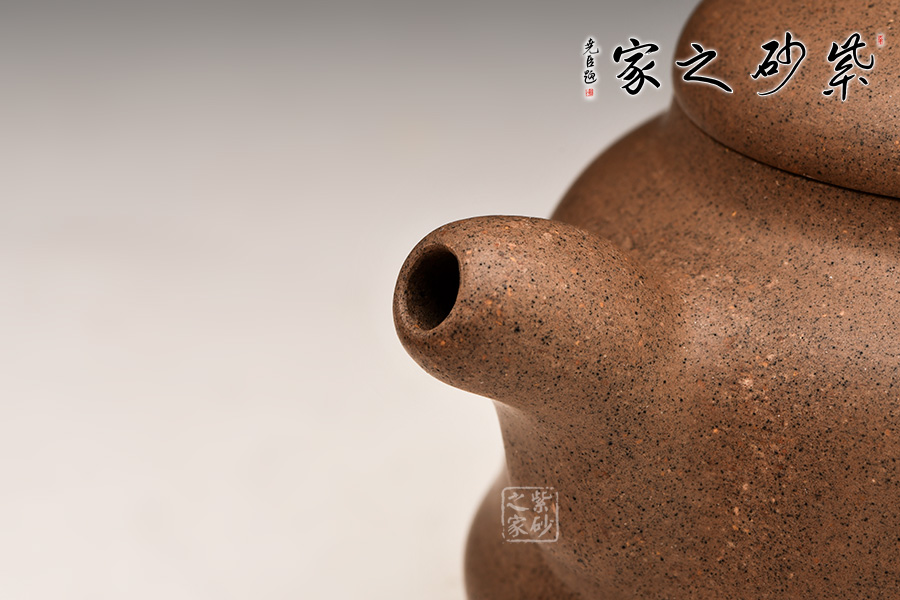 壺身圓潤,上窄下寬,底部微斂成圈足,穩(wěn)重有力。短粗嘴自然胥出,出水、斷流實(shí)用性佳;圓形把形態(tài)優(yōu)美,端握舒適;圓形蓋鈕,精致可愛!整體無不體現(xiàn)作者技藝精湛,具有獨(dú)特的藝術(shù)風(fēng)格。