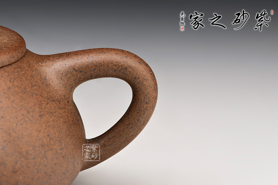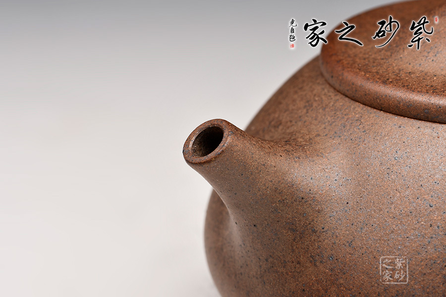 此款壺器型古拙,線面簡(jiǎn)潔明快,還不失沉穩(wěn)大度。壺身仍沿襲古老方法上小下大,使重心下垂,使用起來更穩(wěn)當(dāng)。壺嘴采用短而有力的直筒形,出水的力度更加佳,壺鈕如同一條拋物線連接壺蓋兩端,形如拱橋。整款壺的器型精神飽滿,擁有大氣之風(fēng),此乃收藏實(shí)用之佳品,壺友不可錯(cuò)過的杰作。