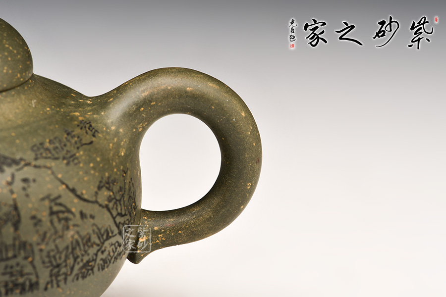 作品醇厚素凈,圓潤豐腴的壺身,自然胥出上揚的彎流,嘴口下壓,出水順暢;耳形壺把,形態(tài)優(yōu)美,曲直有度;加上小巧微鼓的壺蓋及珠形鈕,整體比例協(xié)調,端莊而規(guī)整,線條流暢,耐人尋味。
