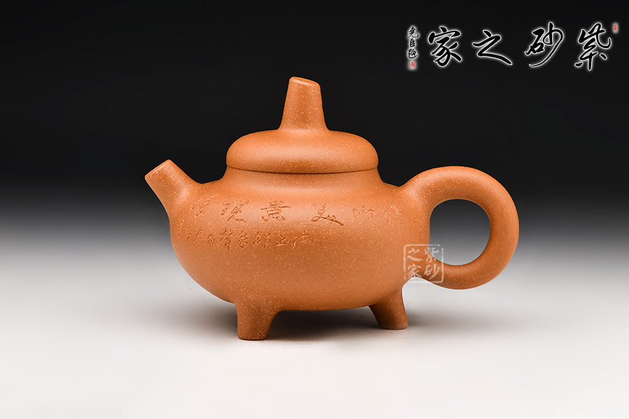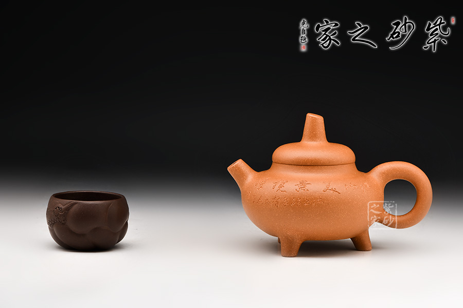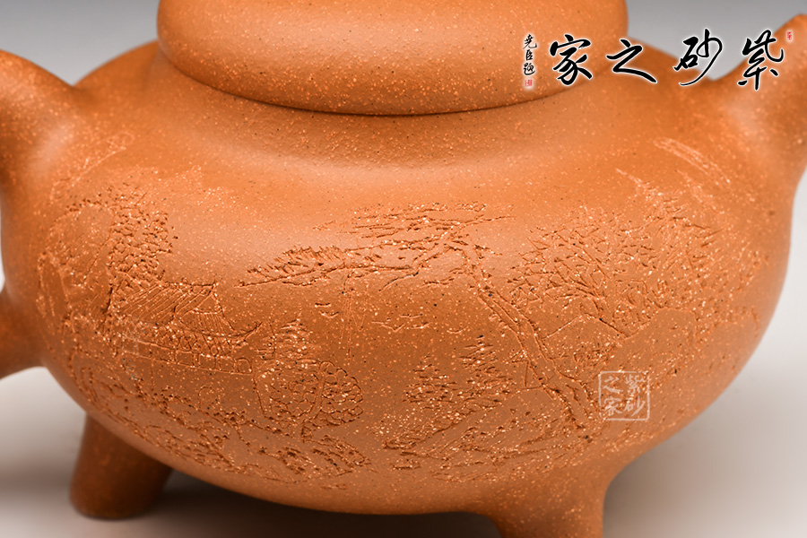 這款“大成”整器簡約大氣,線條流暢雅致,經(jīng)久耐看。壺身是扁圓球型,厚重洗練;壺蓋鼓起,其上柱形壺鈕露鋒芒且沉著,頂部斜切口,更顯十足氣勢;直嘴和環(huán)形把相對應(yīng),一直一曲古拙可愛;壺底部加三鼎足,穩(wěn)重而端方,古樸而渾厚。