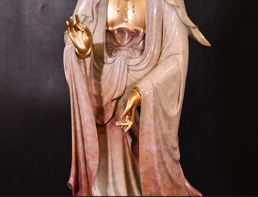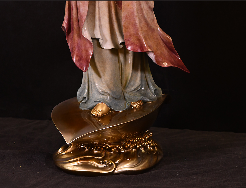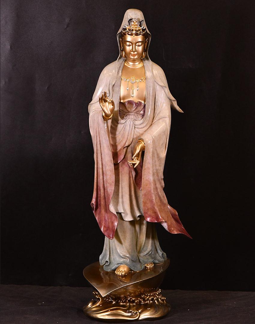產(chǎn)地:福建 工藝:高溫著色 創(chuàng)作年份:2020 題材:觀音菩薩 繪制時間:0日 尺寸:*68cm 裝裱: 材質(zhì):紫銅 使用場地:走廊