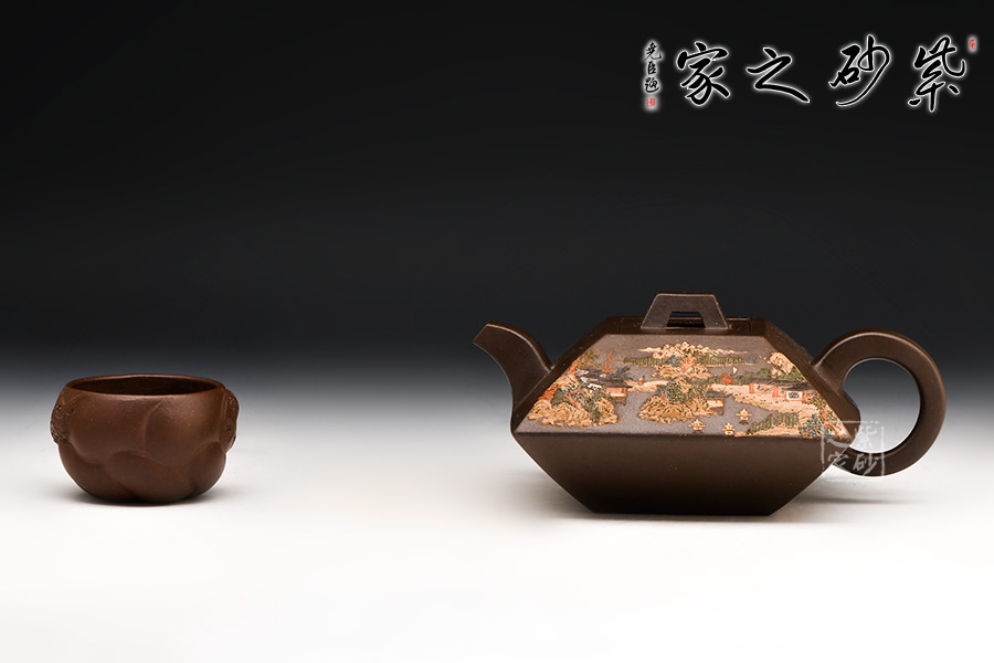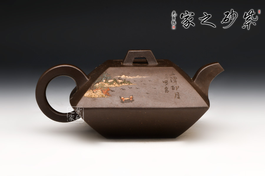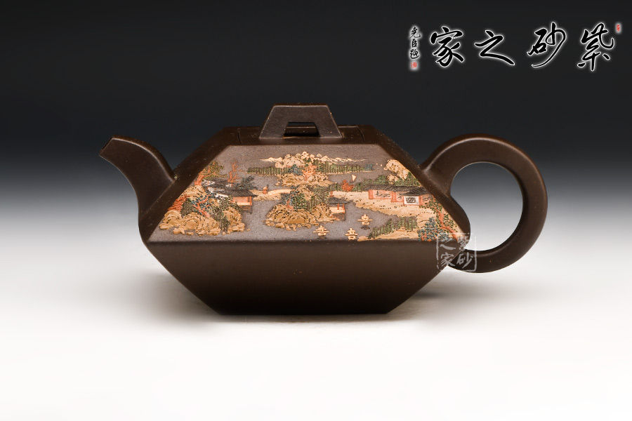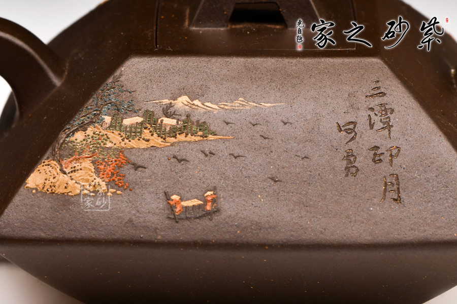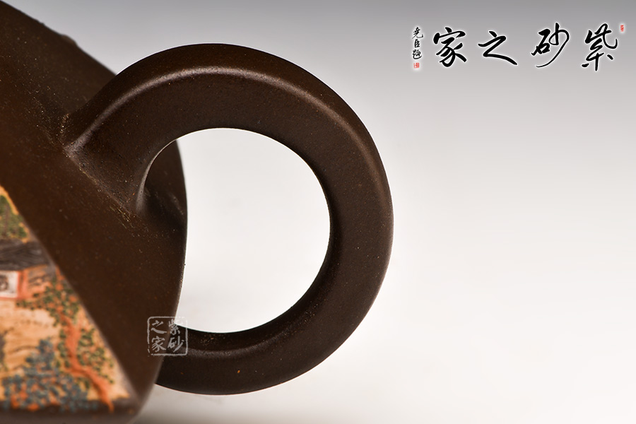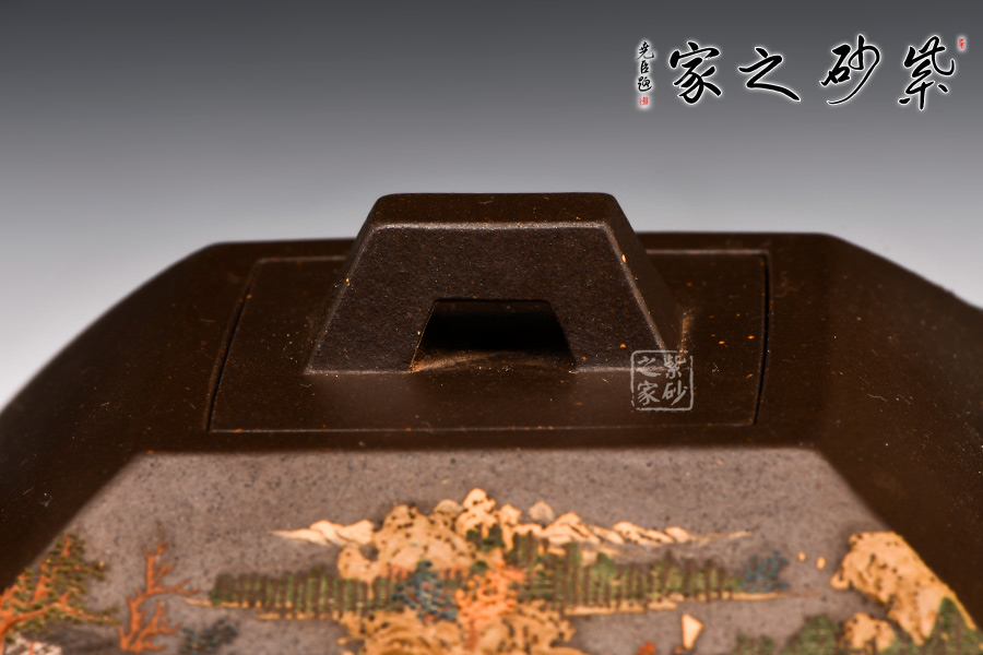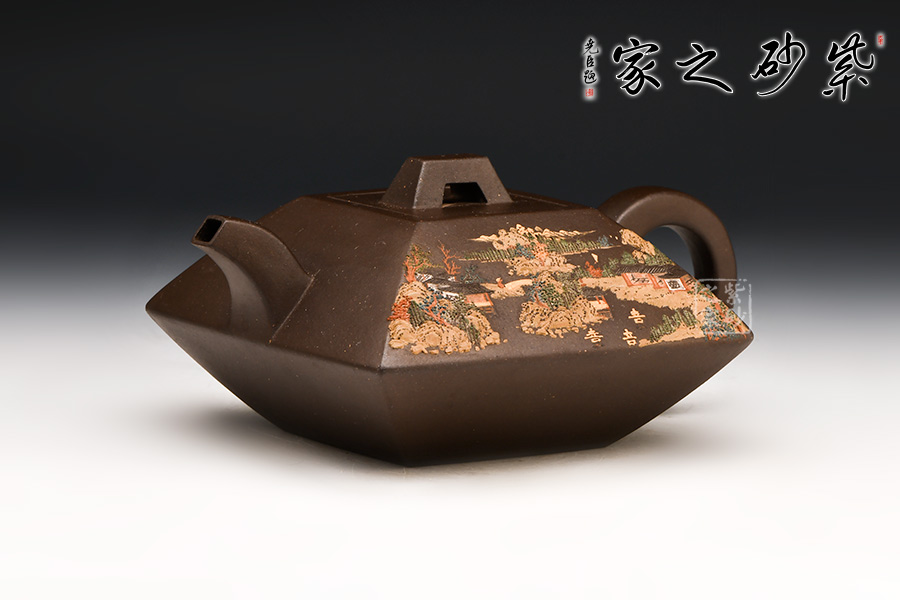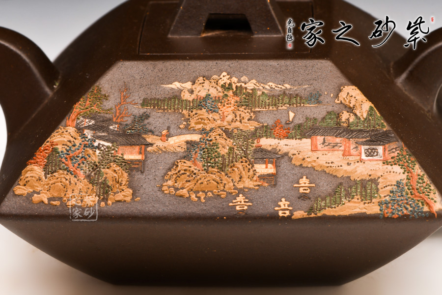 此壺棱角分明,方正可鑒,四平八穩(wěn),通身泥繪山水裝飾,寓形寓意,聚天地之靈氣,乃智慧之壺。