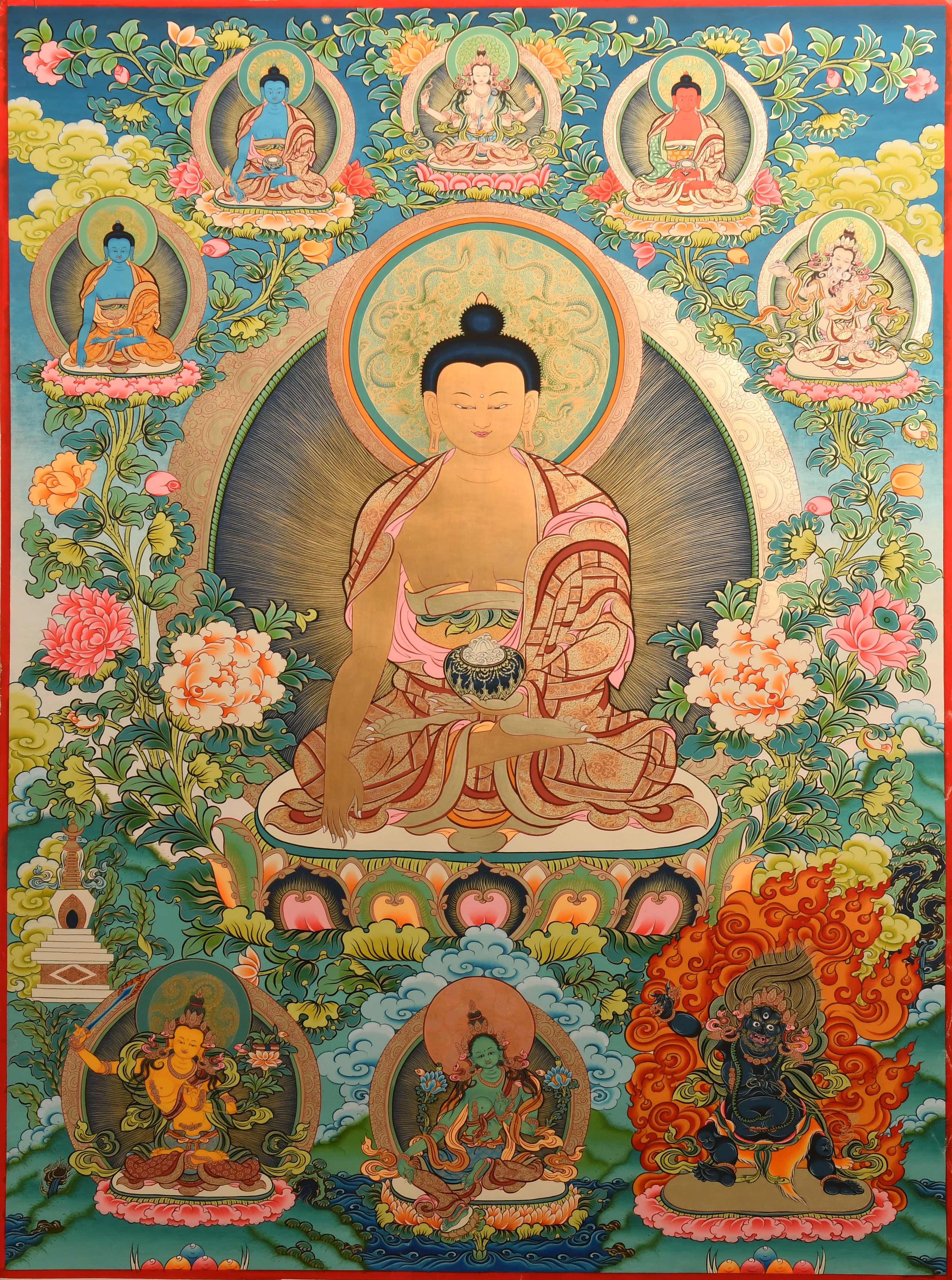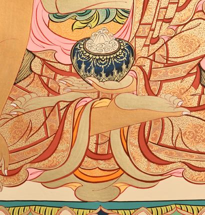 | 唐卡是歷史的瑰寶,現已被例入國家非物質文化遺產名錄,得到了高度的重視和保護。同時由于顏料的珍稀、繪制周期長、工藝復雜大大增強了其珍藏價值。一幅好的作品可遇不可求,近年來唐卡已成為收藏界炙手可熱的藏品。 | 唐卡的形式便于攜帶,其內容體現了藏傳佛教的莊重、神圣、華貴,被稱為“移動的佛像”。同時也是修行者積累善業,追尋心靈的平靜與安寧的一個過程。 | 唐卡的內容包羅萬象,它以圖像的方式承載著藏族文化精髓,是藏族智慧的結晶,廣泛傳播了藏地的文化、歷史和宗教理論。 | 唐卡絢麗的色彩、流暢的線條、嚴謹的結構,都充滿著濃郁的高原和游牧民族風情,無疑是難得的藝術珍品。值得一提的是唐卡繪制顏料全部為天然礦物顏料,畫面效果艷麗,可以保存千年而不變色。 |
