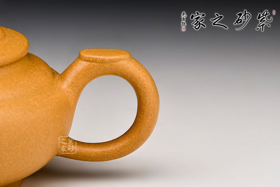 扁圓壺體上的是塊面最簡潔的平板橋,立于壺頂,是個橋形鈕,身上清茶水波,晃動著漣漪。把手上亦有一塊橋面,立在把環(huán)的最頂部,有如虛空的拱橋上部的平坦的橋面,這是端茶倒水時拇指的摁壓處。