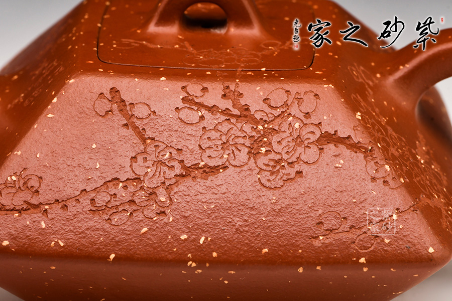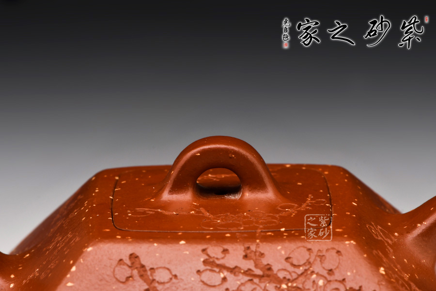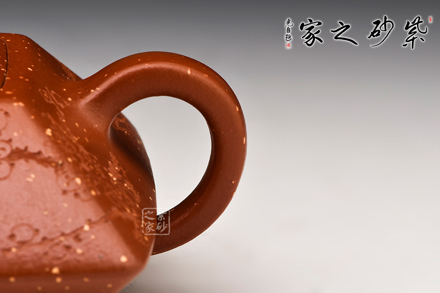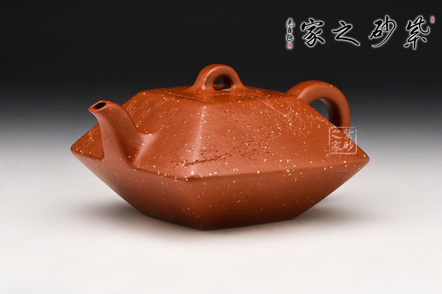 赤龍煥彩,采用家藏大紅袍朱泥底料結合極其珍貴黃金段料研磨成顆粒,請教原紫砂廠練泥車間老師傅,進行多次配比實驗,燒成后黃金段顆粒自然排列有如龍之金鱗,融合的大紅袍朱泥特性,故名赤龍煥彩。