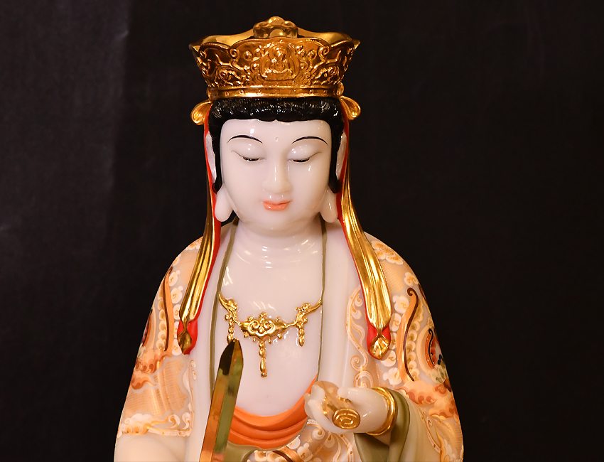 此佛像高度為48CM,工藝制作嚴(yán)謹(jǐn),佛像莊嚴(yán)殊勝,細(xì)節(jié)精致細(xì)膩,色彩鮮艷明亮。