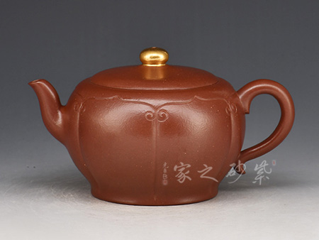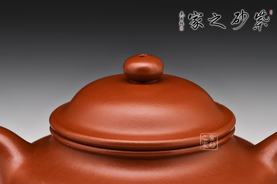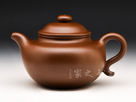 紫砂蓮子造型,鼓腹、圈底、耳形把、二彎流,蓋面凸起,蓋唇與頸唇外翻并相互吻合,口蓋嚴(yán)密、制工精雅、泥色肥潤(rùn)、曲線柔美、器型飽滿。