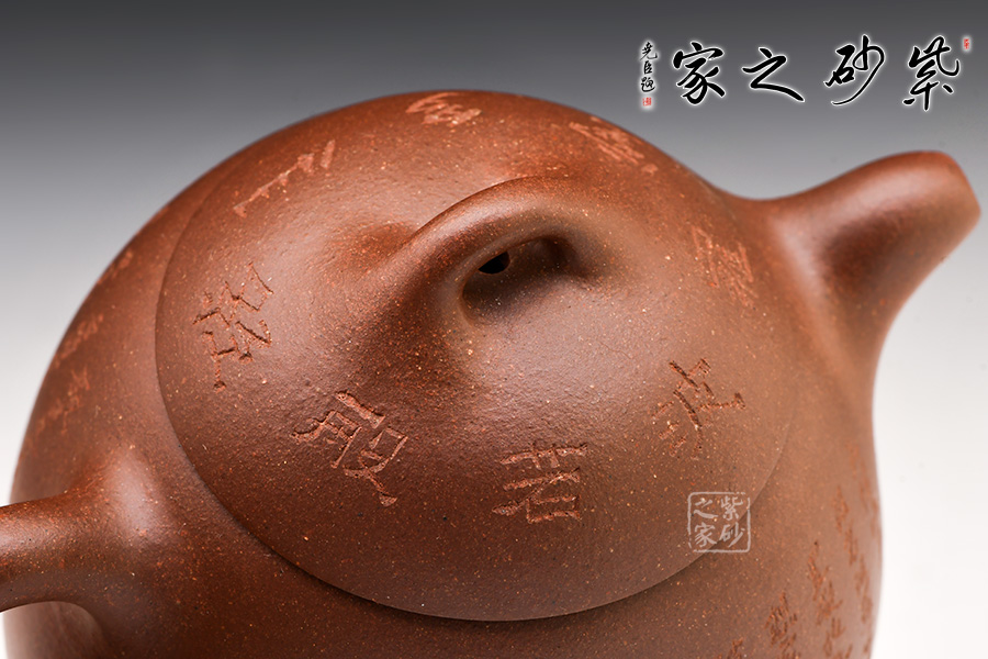 壺身通刻《心經(jīng)》,讓紫砂披上一層佛家的霞光瑞靄,熠熠生輝?!缎慕?jīng)》全篇268字,非??简?yàn)陶刻功力。