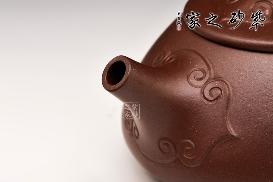 壺嘴流把均顯細膩,與壺身銜接處以如意紋飾之,直流嘴挺峭而出,與壺把的三角形相應和,壺把三角形轉角圓潤,極為有力度;