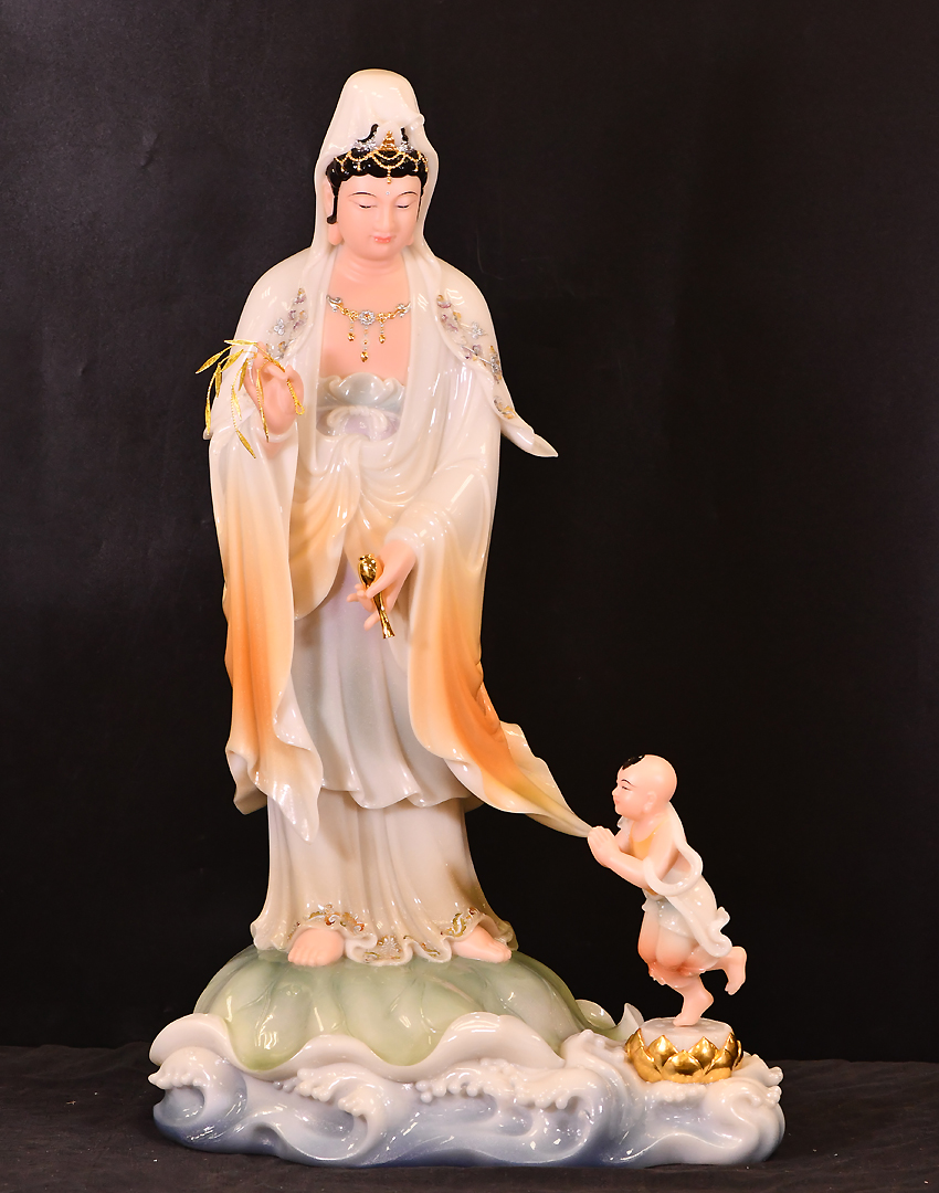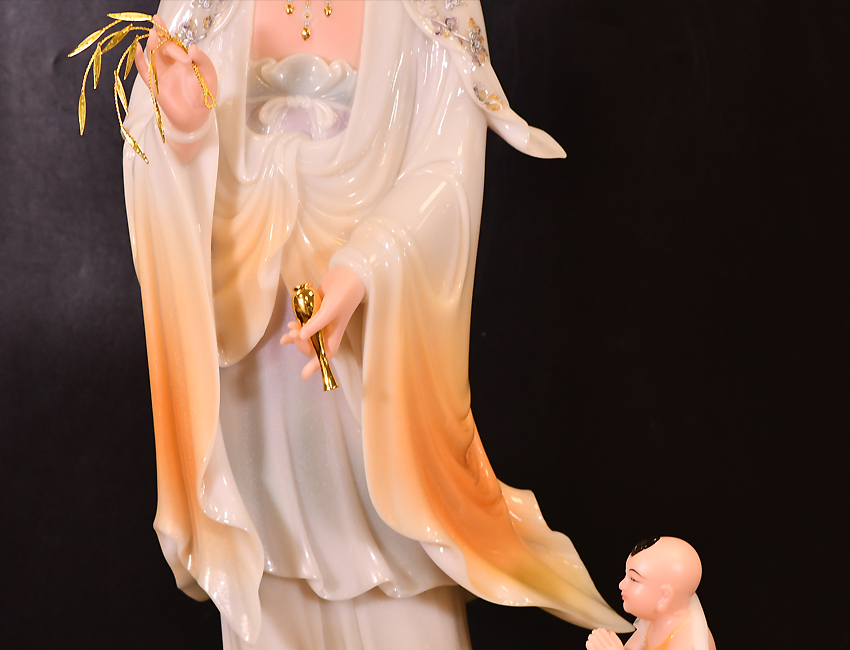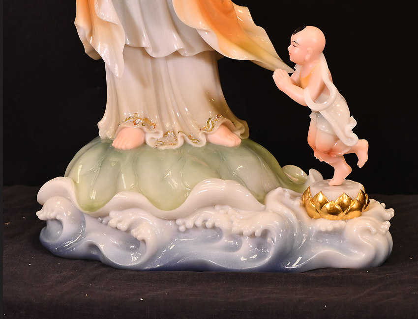此觀音像高度為68CM,小孩在觀音身側(cè),俏皮的扯著觀音衣角,觀音則微微側(cè)頭看向小孩,摒去傳統(tǒng)的束縛,使畫面更生動(dòng),有活力。