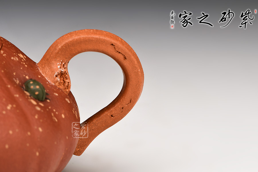 壺身瓜脈紋理清晰,瓜蒂為壺蓋,瓜藤圈成壺把,氣勢(shì)得體,舒展自若,富有田園畫意。瓜身上棲息著一只綠色的七星蟲(chóng),既增加色彩,又起到了畫龍點(diǎn)睛的作用,生活氣息濃郁,體現(xiàn)出美麗的田園情趣。