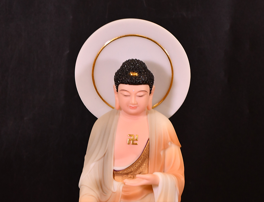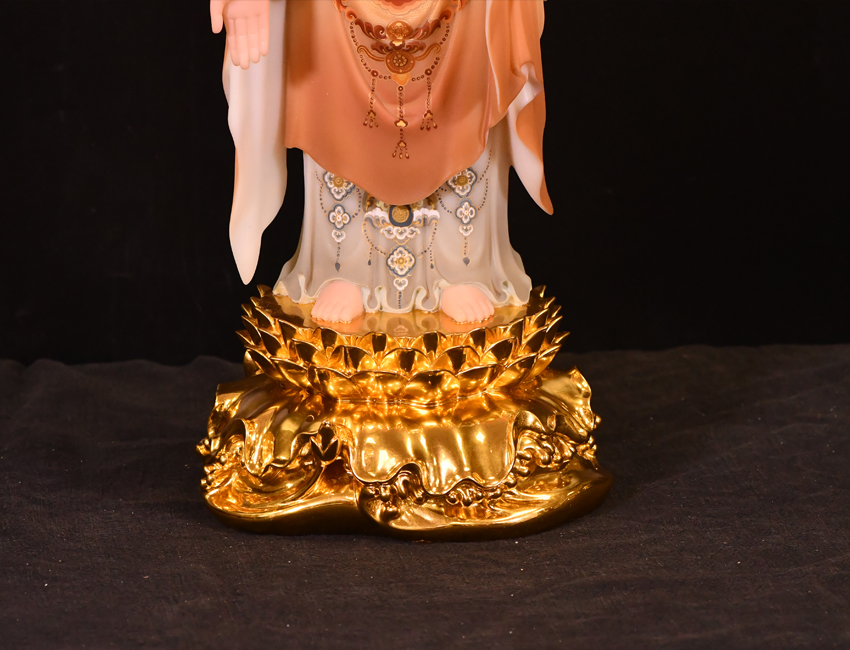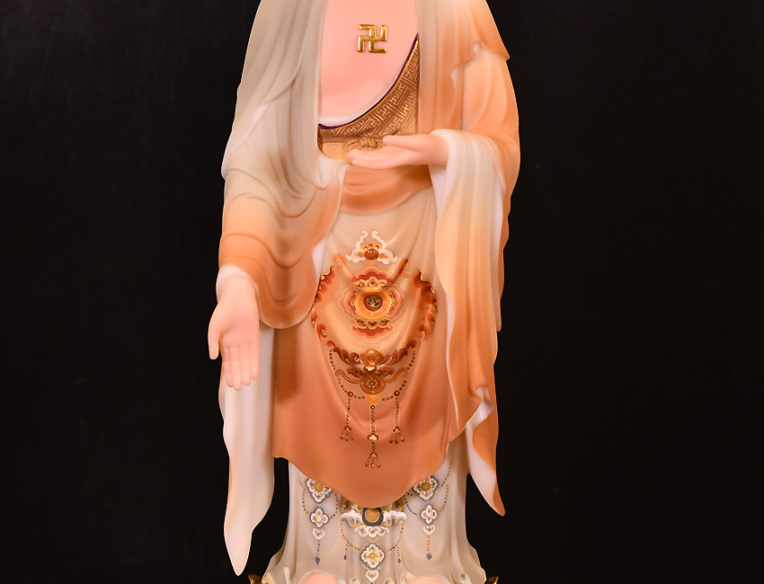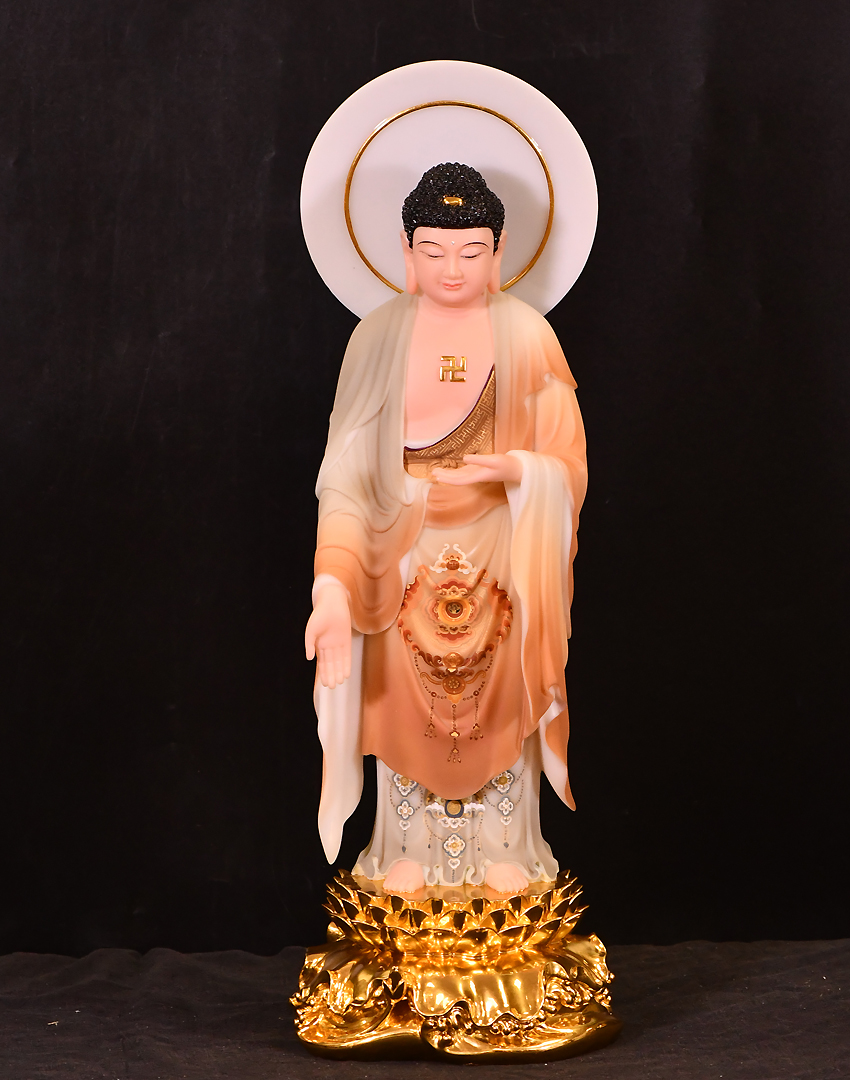 此尊佛像高度為48公分,站立佛形象,材質(zhì)為玉石材質(zhì),用彩釉工藝制作而成。