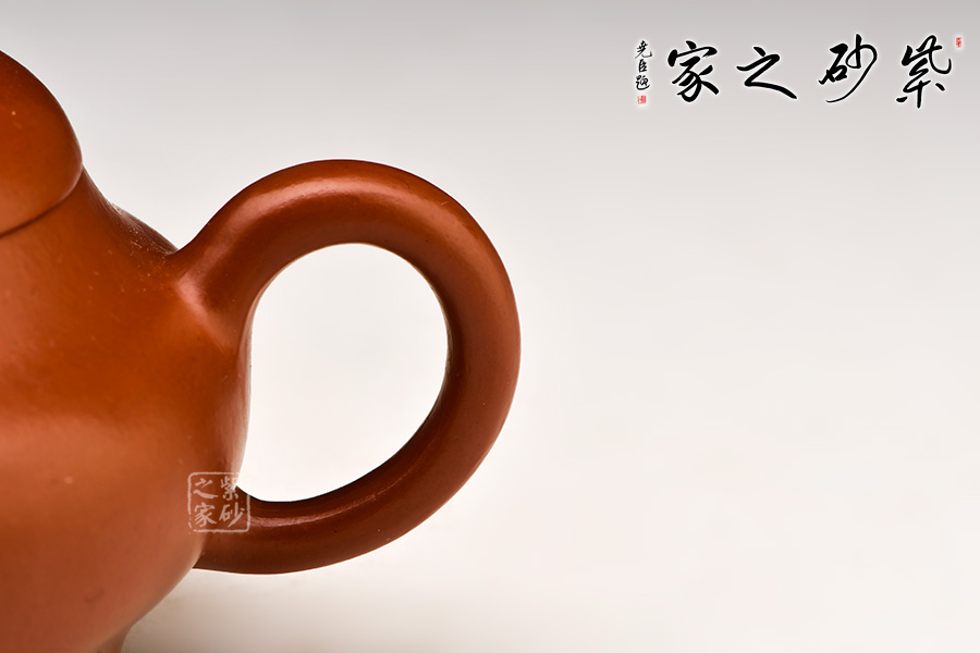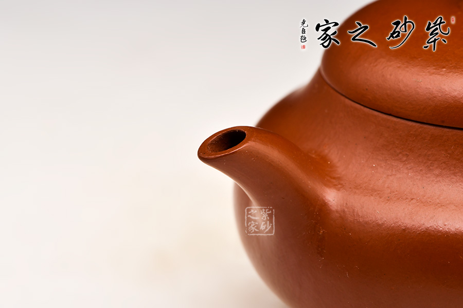 趙莊朱泥制作而成,泥質(zhì)細膩,色澤極美。 壺身圓融,流把方圓兼濟,將剛?cè)嶂馊谌肷駸暨@款傳統(tǒng)壺型中,更具意境。整款壺形如神燈,線面自然毫無呆滯、造作之感。