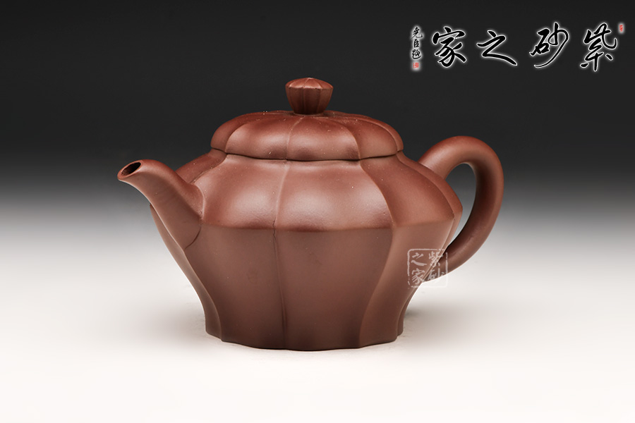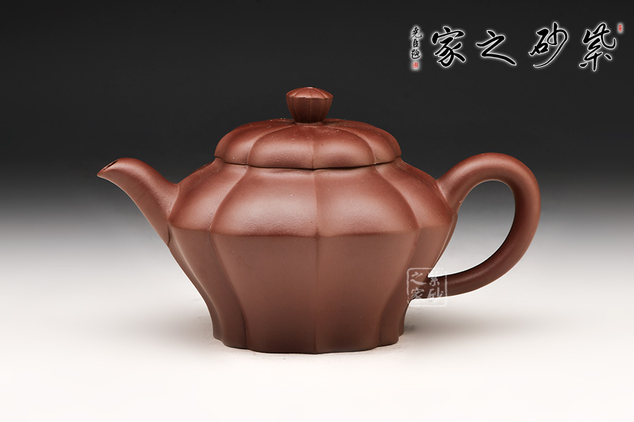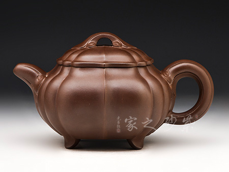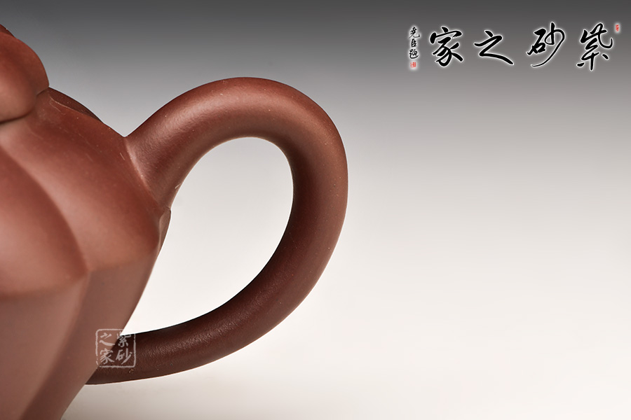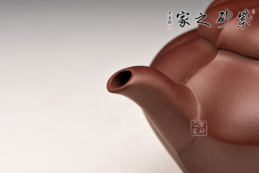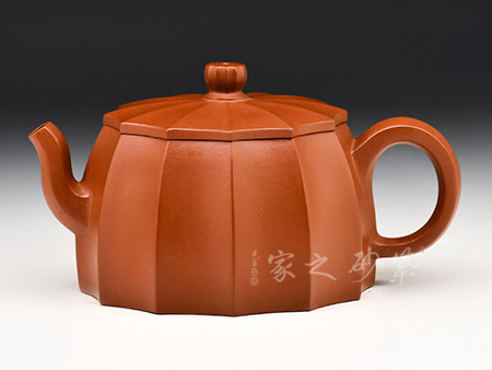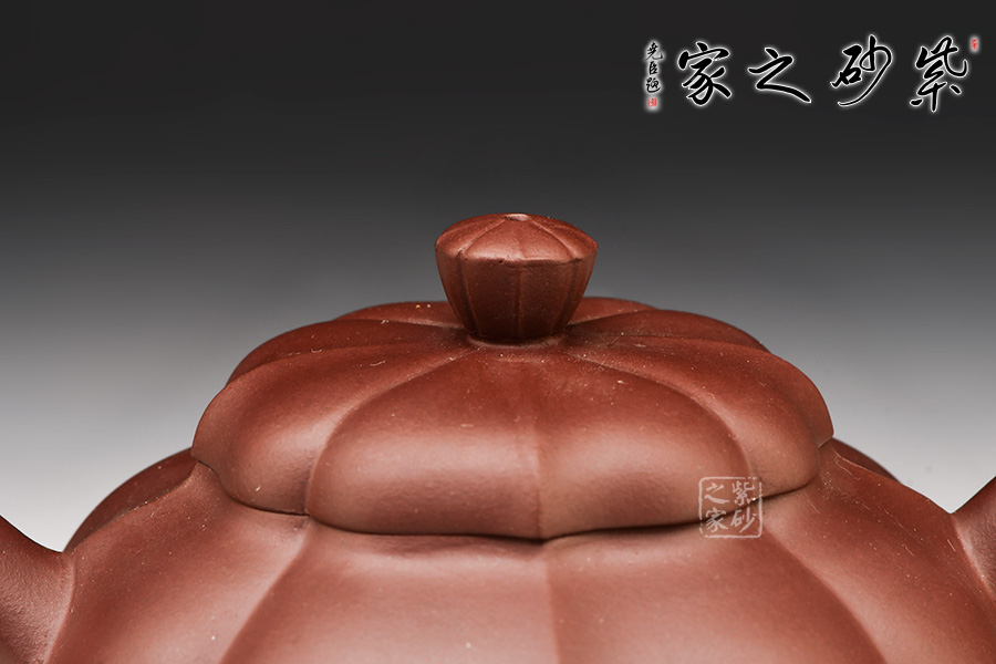 此壺以菱花為壺體創(chuàng)作要素。俯視壺身、壺蓋、壺鈕均有菱花線條組成,輪廓線條飽滿,口蓋嚴(yán)密,是筋紋器中經(jīng)典之作。