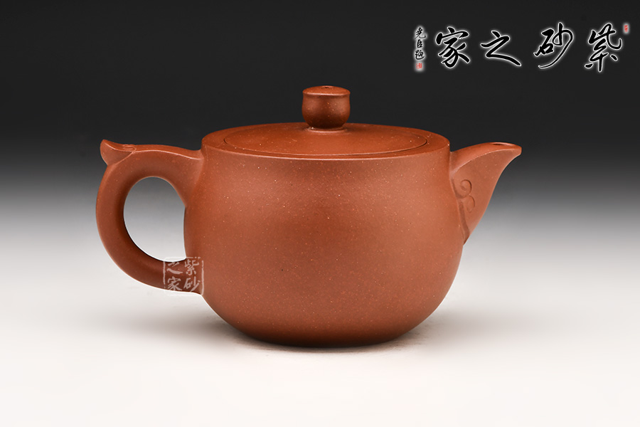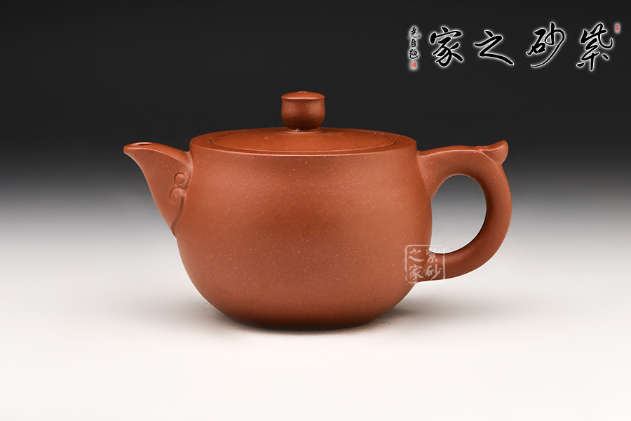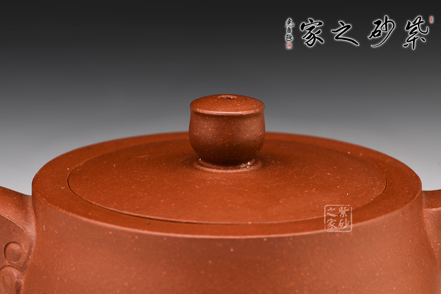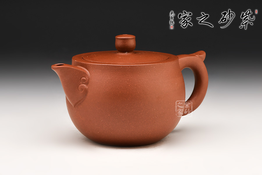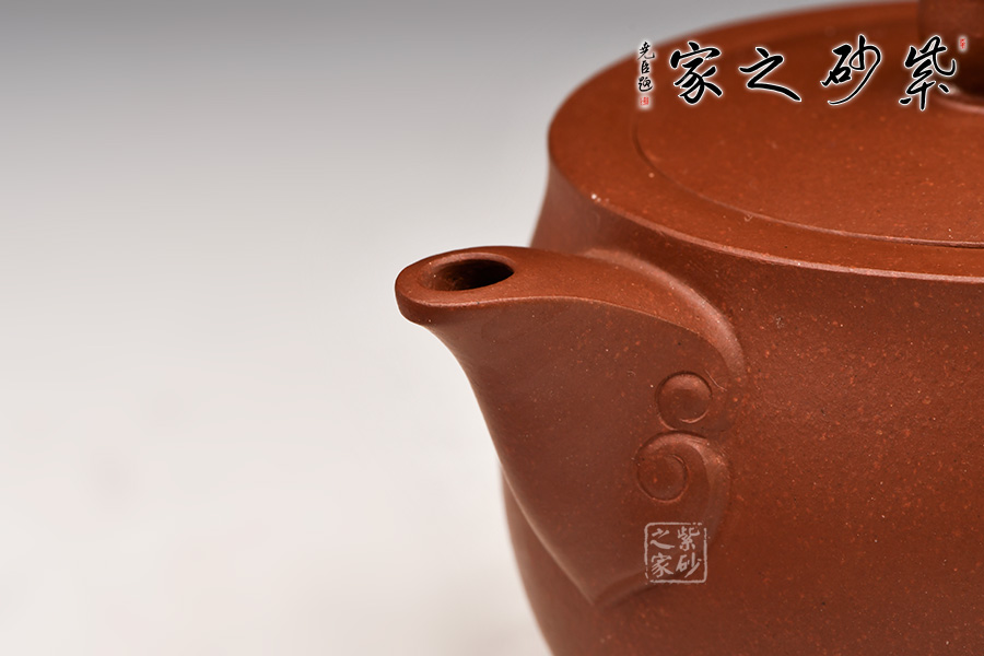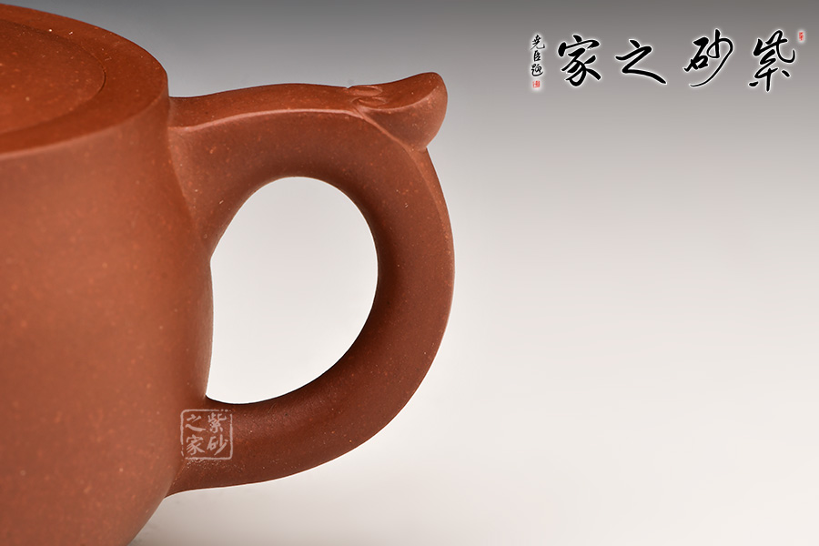 如意壺骨肉勻亭,扁腹,碗形,穩(wěn)重大方。壺流胥出自然,壺把勻勢而起,且都點綴如意紋飾。壺鈕與壺身型制相似,兩者呼應。整器精美絕倫,而且能夠在泥色的襯托下呈悠然、典雅之美。