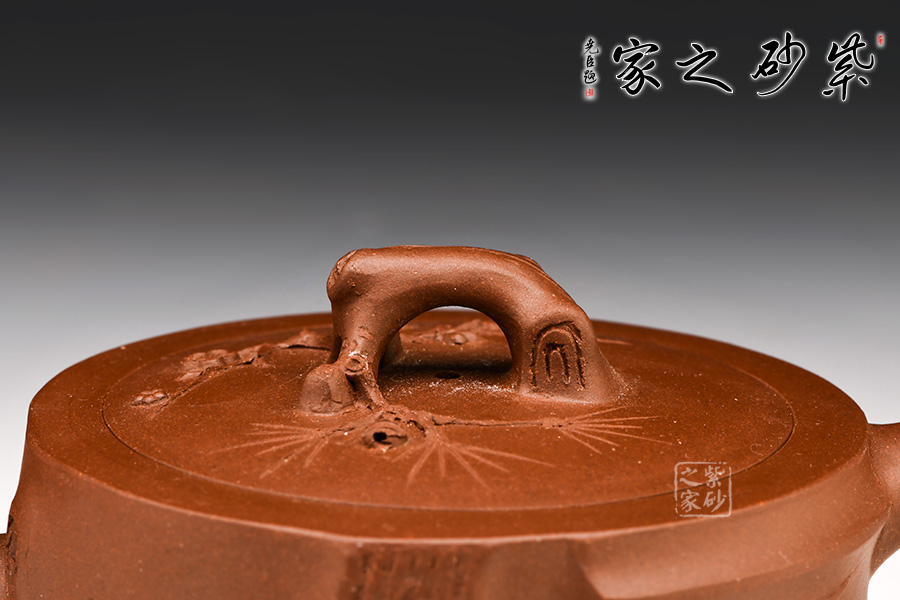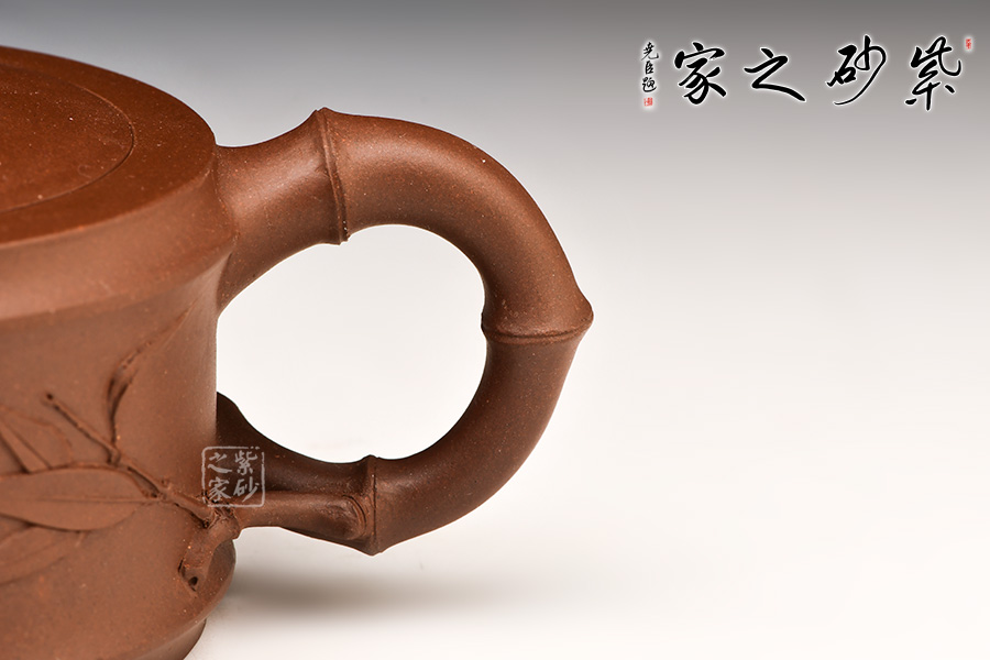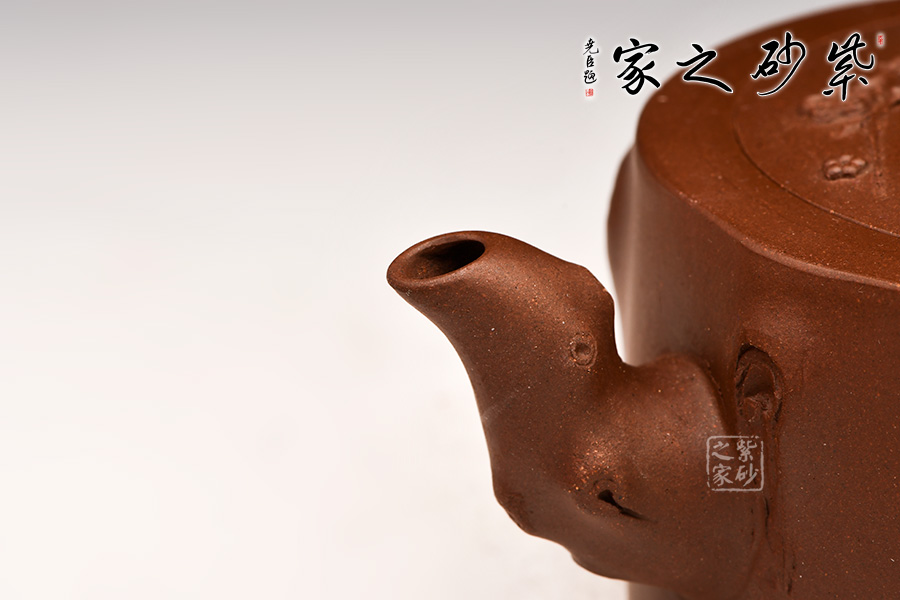 壺鈕以松枝蒼涼為感,枯藤古樸,形象逼真。壺把則是以竹節(jié)為韻,宛若一顆蒼勁的竹竿,彎曲叩首而成,竹影疏疏。壺嘴以梅枝為原型,端正淳樸,給人一種高風(fēng)亮節(jié)之感。整壺給人之感,意味無(wú)窮,值得把玩。