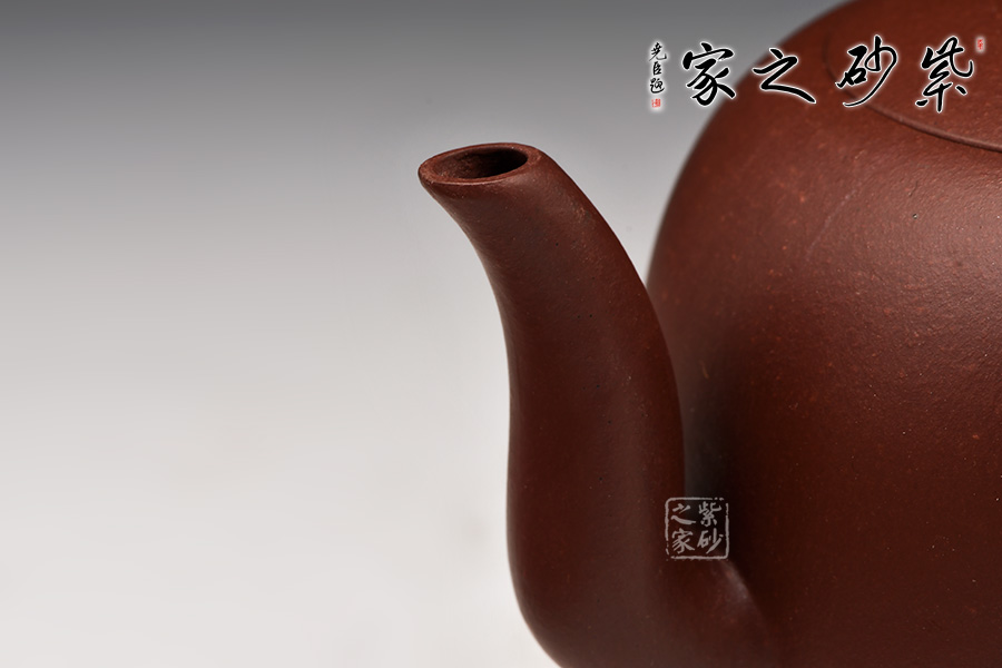 圓潤(rùn)飽滿,大方得體,蓋面和壺身過(guò)渡自然,仿佛合為一體,整體線條柔順怡人,長(zhǎng)三彎流也流暢無(wú)礙,故常被視為較難掌握的器型之一。整器造型不拖沓,別有剛強(qiáng)內(nèi)在,形神氣韻富有美人之風(fēng)雅。
