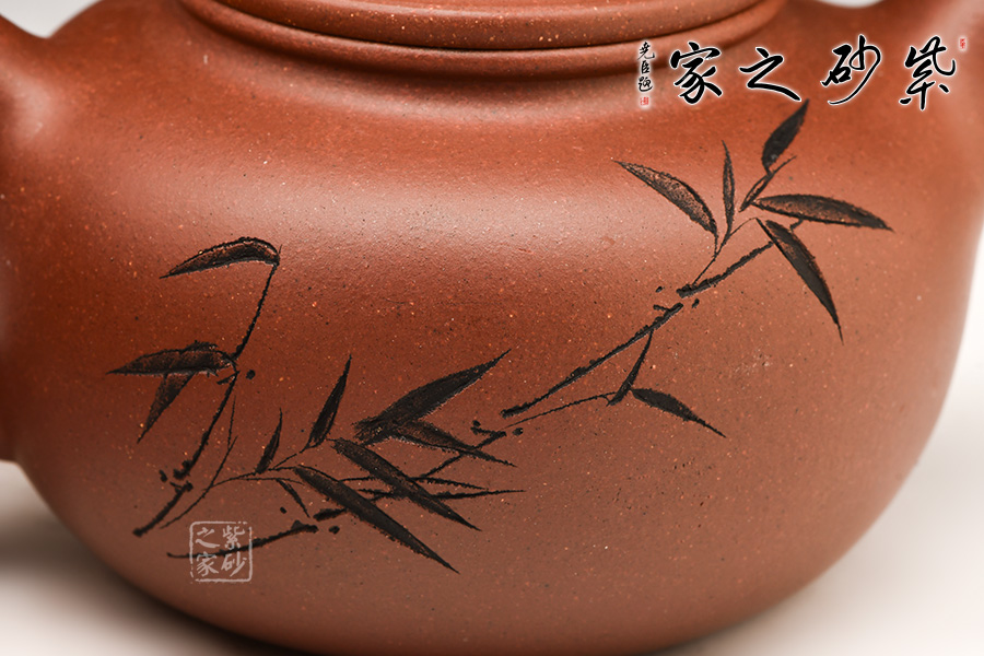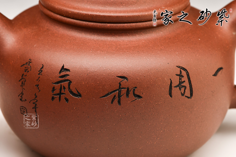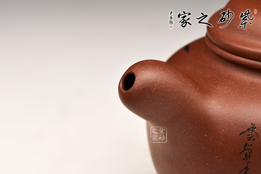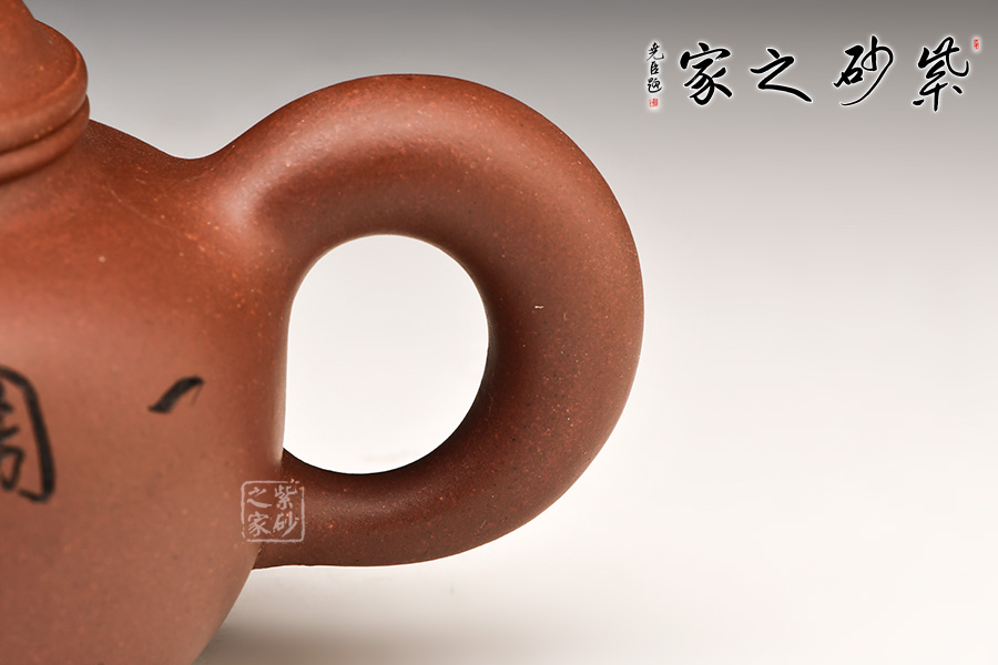 鼓型的身筒,飽滿厚實(shí),象征著五谷豐收的吉祥寓意??谏w緊密結(jié)合,渾然一體。粗把,短嘴,增加了壺體的穩(wěn)定感,全器流露出沉穩(wěn)雄健、典雅凝練的氣勢。