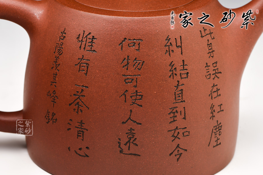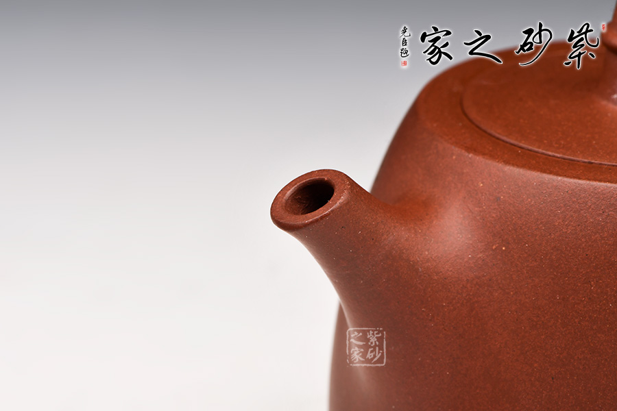 造型規(guī)整,壺身如鐘,氣勢浩然。平嵌蓋,與壺融為一體。柱鈕上部置圈線,流直口平,耳把似方,形筒古樸。整器亦樸亦雅,亦古亦今,體現(xiàn)了李老師對紫砂壺的美學(xué)追求。