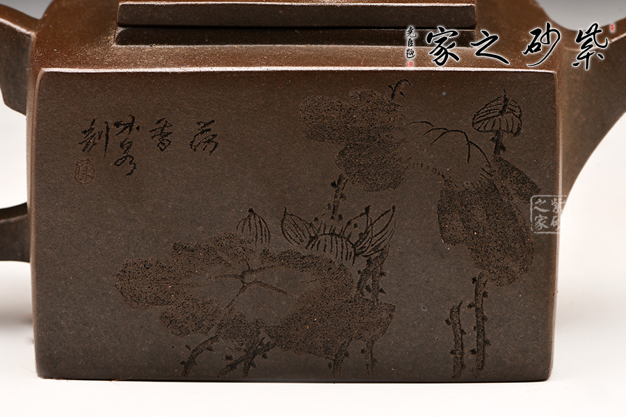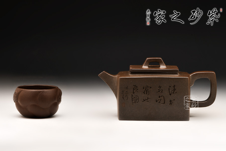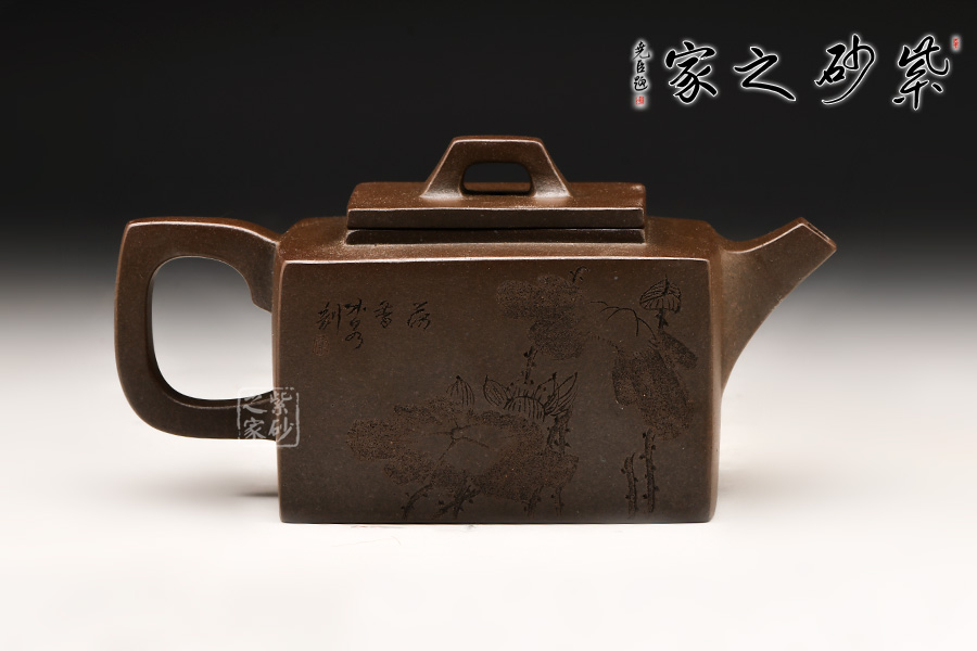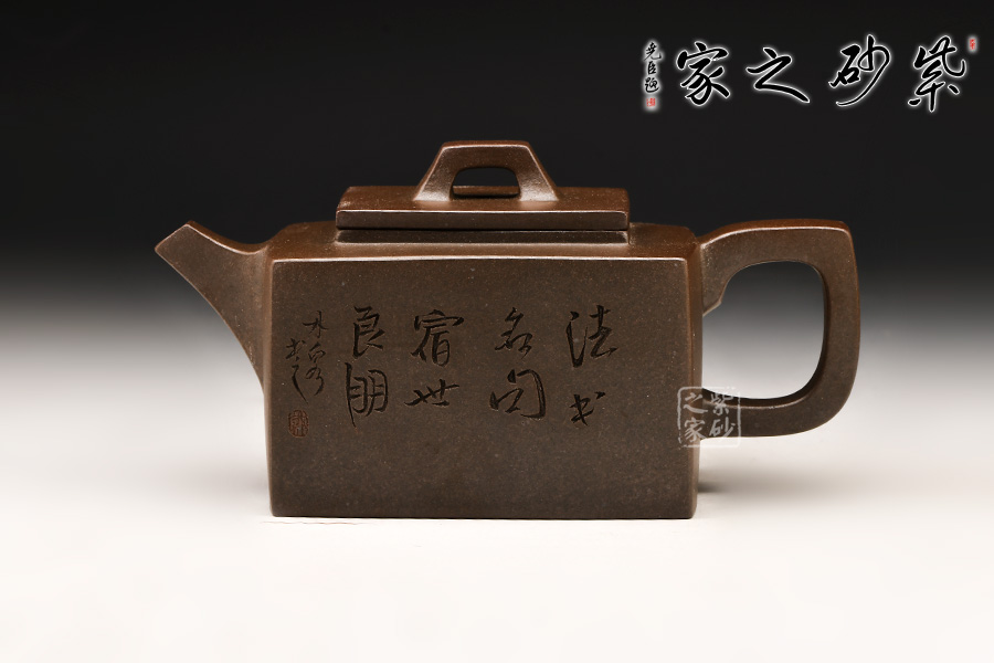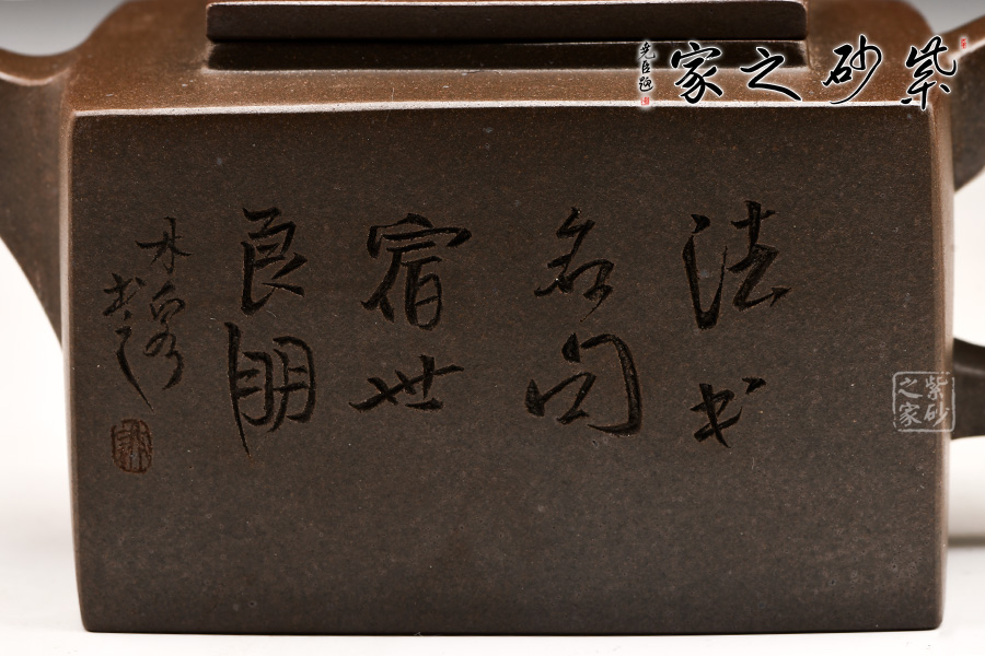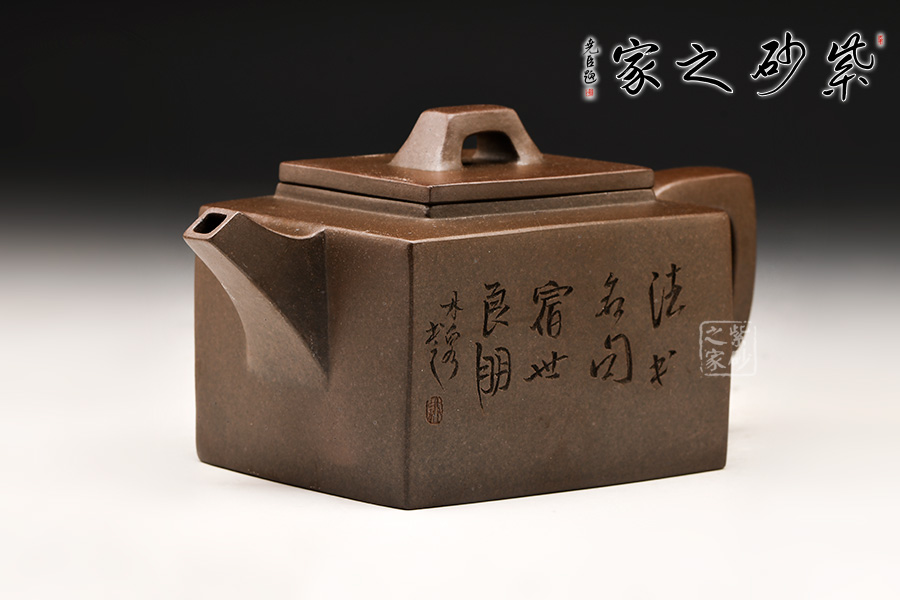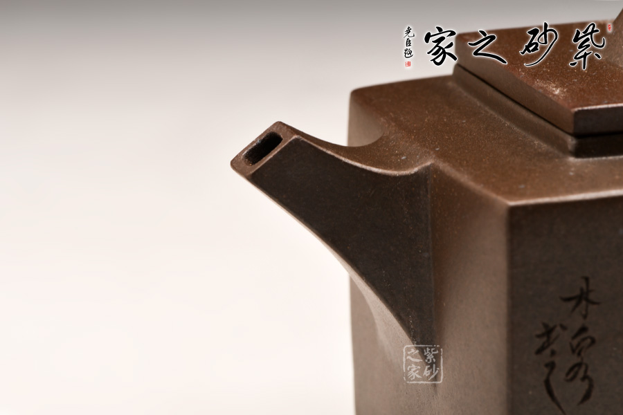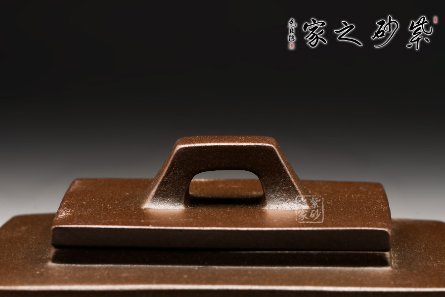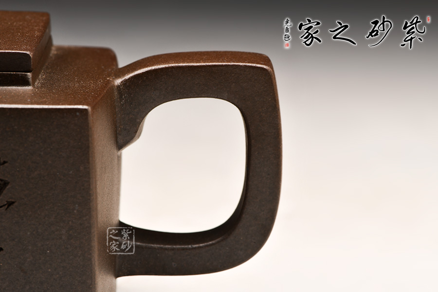 此壺器形似磚,主體、附件均由直線組成,為傳統(tǒng)優(yōu)秀壺式。制作顯其功力,線面干凈利索,直挺不板,給人以坦坦蕩蕩之式。