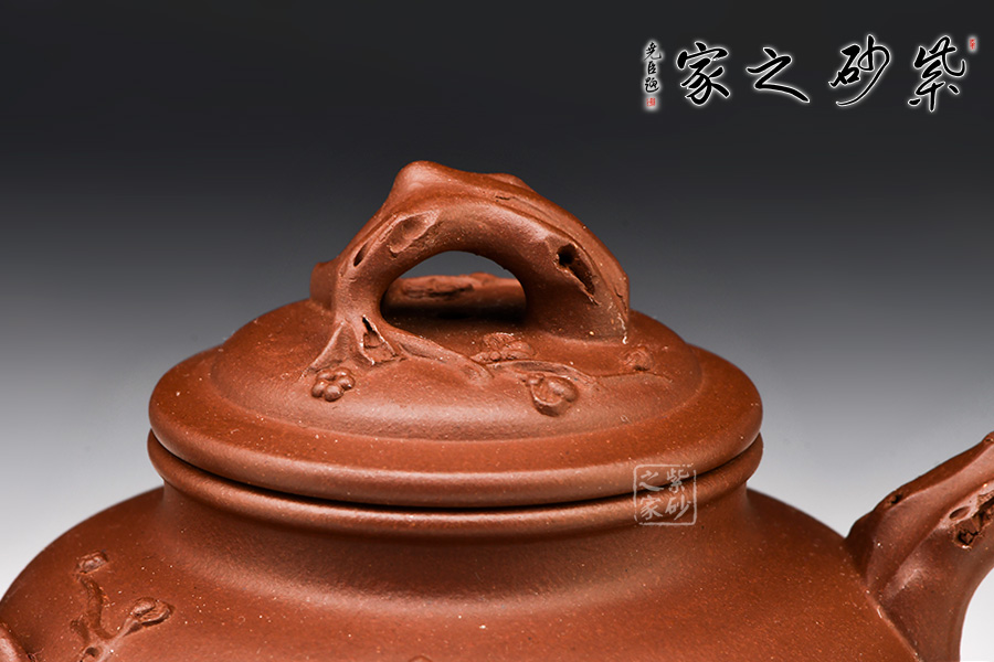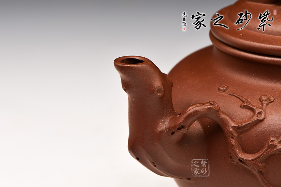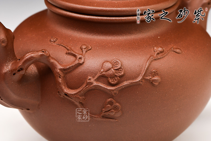 “報(bào)春壺”是以梅花報(bào)春為主題,在挺秀飽滿(mǎn)的圓形壺身上,運(yùn)用雕刻和捏塑等多種手法,生動(dòng)地刻畫(huà)了梅花不畏風(fēng)霜嚴(yán)寒,依然俏麗生姿的精神面貌。