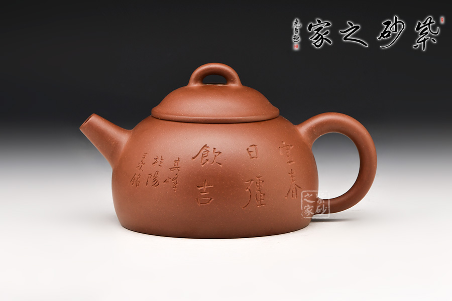 半瓢壺也叫曼生壺。壺體呈半瓢狀,底槽青胎質(zhì),蓋與壺身渾若一體,壺寬口,溜肩,直流,環(huán)柄,腹部飽滿,闊平底,蓋上設(shè)拱形鈕,氣韻不俗。