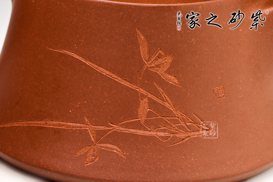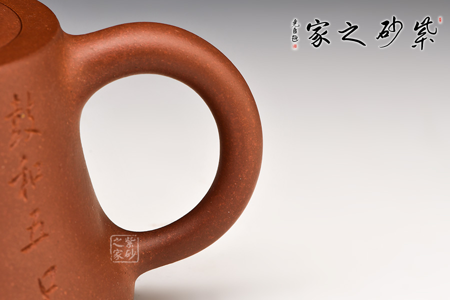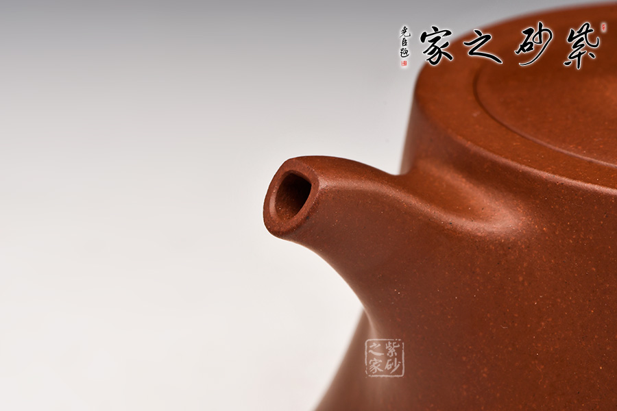 此壺精選原礦底槽青制成,泥質(zhì)柔嫩細膩。壺嘴為彎流,暗接于壺身,出水迅猛爽利;端把彎呈大耳形,骨肉亭勻,端握舒適有力。壺蓋平和緩順,嵌蓋式,緊密貼合,氣密性良好,加之扁圓的壺身如同寶鼓,實用又美觀!