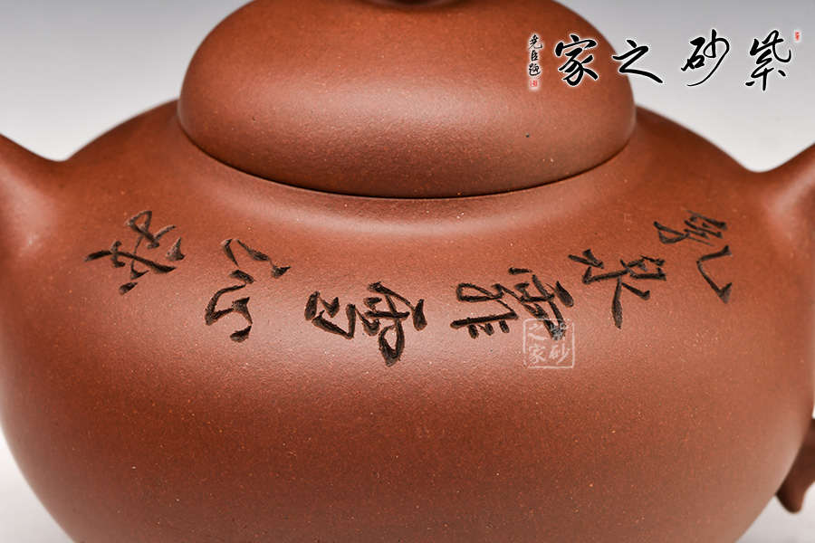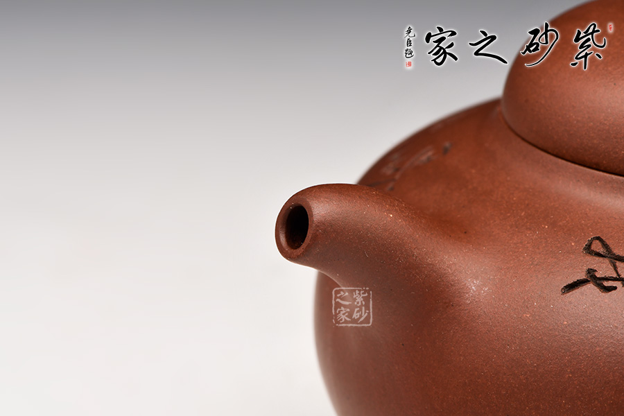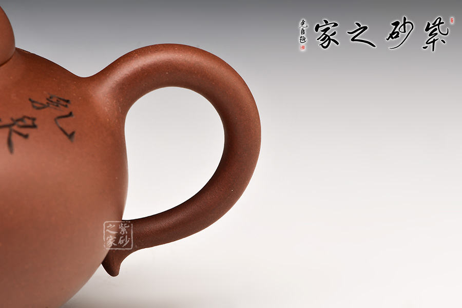 壺身形體飽滿,渾圓如珠,光滑細(xì)致,壺嘴、壺把、壺鈕與壺身搭配協(xié)調(diào),比例勻稱,壺嘴出水有力,壺把力度感強(qiáng),壺蓋設(shè)計(jì)豐腴,口蓋嚴(yán)密,各部銜接不見(jiàn)痕跡,渾然一體,流暢的線條強(qiáng)化了律動(dòng)的視覺(jué)效果。