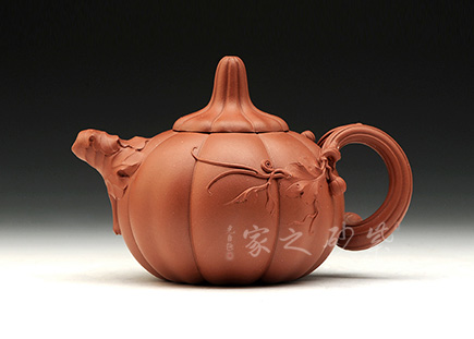 南瓜形壺,具有自然生動(dòng)敦實(shí)的輪廓,瓜瓤豐滿,生機(jī)盎然。瓜蒂為蓋鈕,瓜葉卷成壺嘴,瓜藤圈成壺把,氣勢(shì)得體,舒展自若。壺身瓜葉藤蔓別具生氣,纏攀自然,布局合理,生活氣息濃郁,體現(xiàn)出美麗的田園情趣。