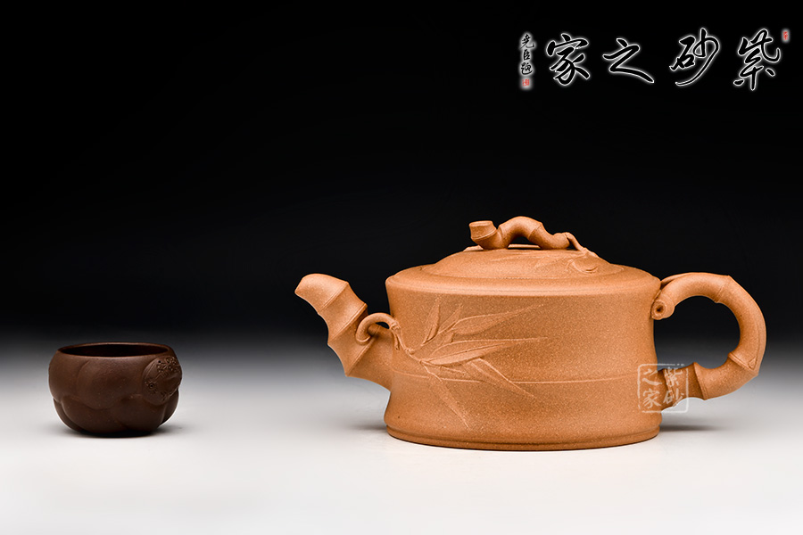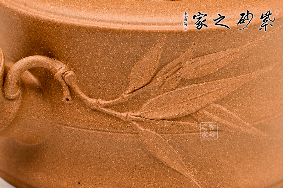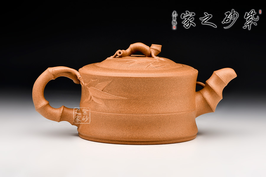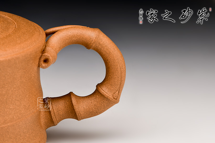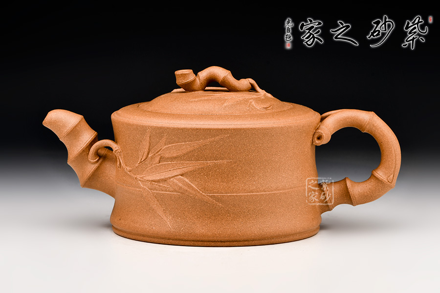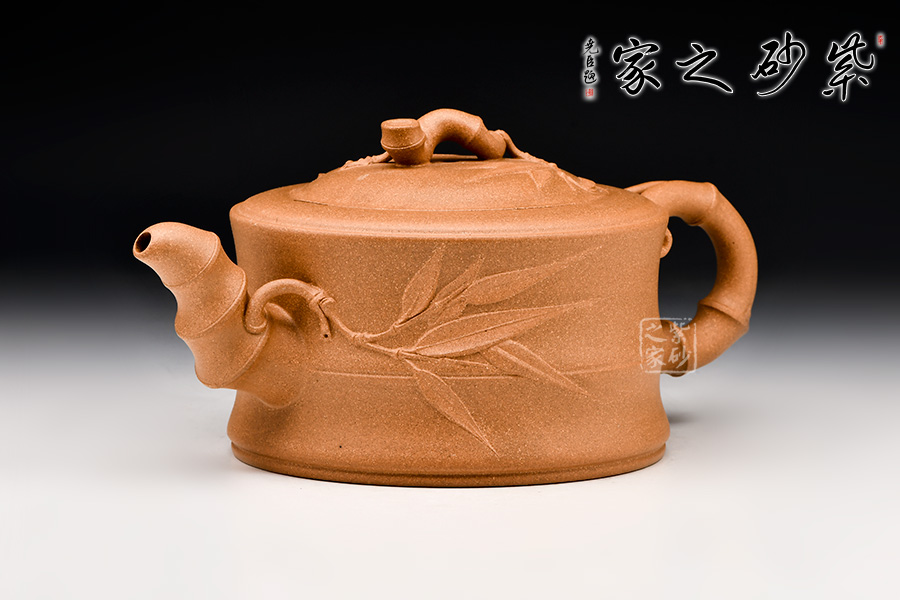 穩(wěn)穩(wěn)的壺身中,可感覺到竹的靈氣,彎曲的竹枝為滴手和壺把,曲卷翻動(dòng)的勢(shì)與度恰到火候。