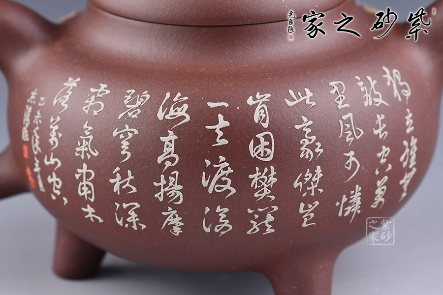 光貨離不開裝飾。俗話說“壺隨字貴,字隨壺傳”:光壺不刻字,就是一把光壺;壺上面刻了大師、名人的字,一把壺的含金量就高了,收藏價值就更高,升值潛力就更大。王福君與中國工藝美術(shù)大師譚泉海合作最多,其次是徐安碧、鮑志強(qiáng)、毛國強(qiáng)(均為中國工藝美術(shù)大師、中國陶瓷藝術(shù)大師)。