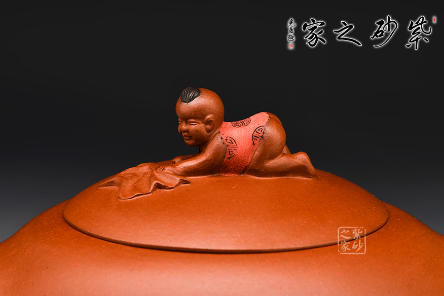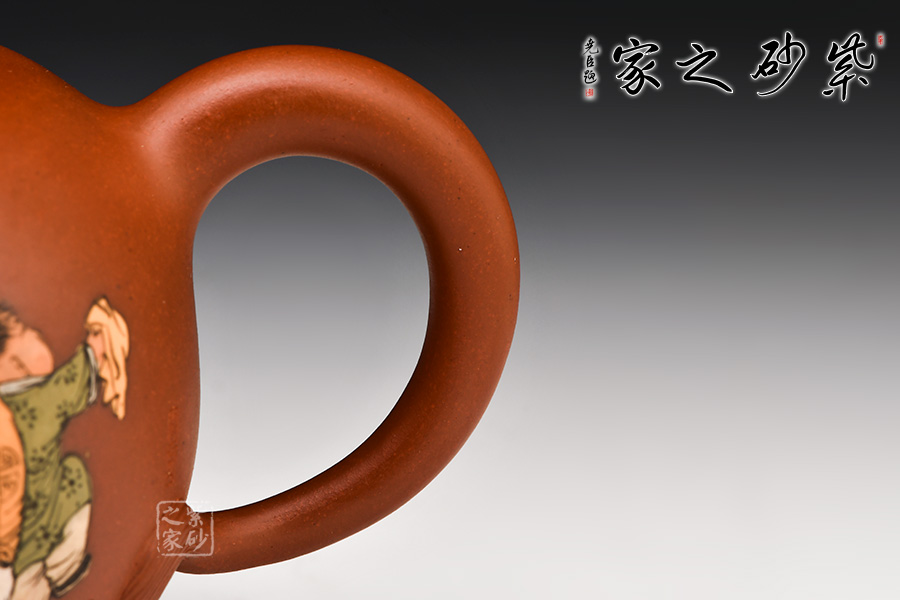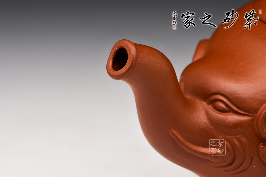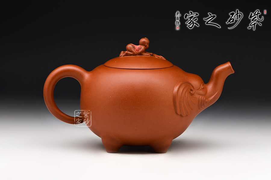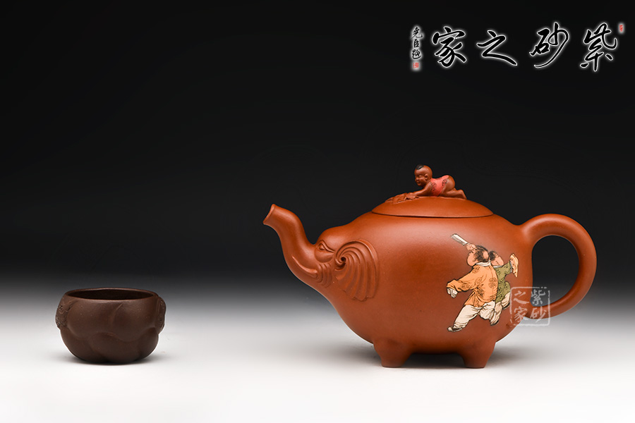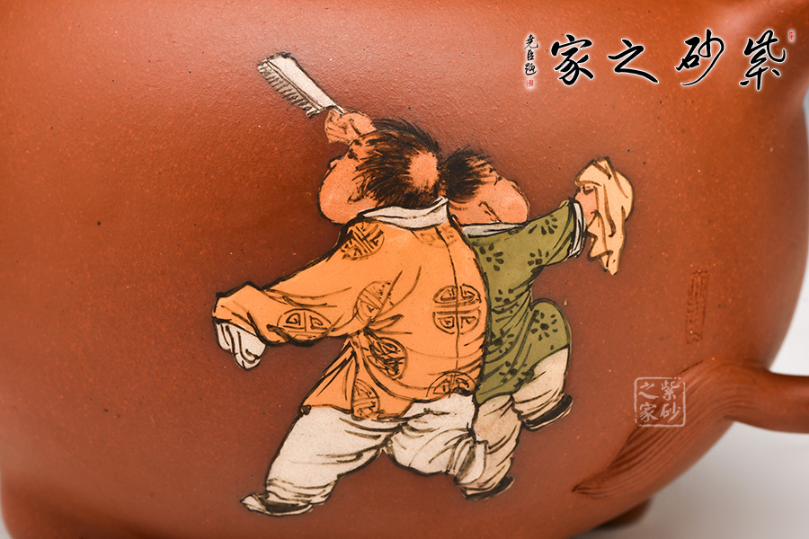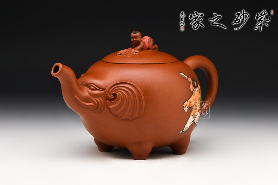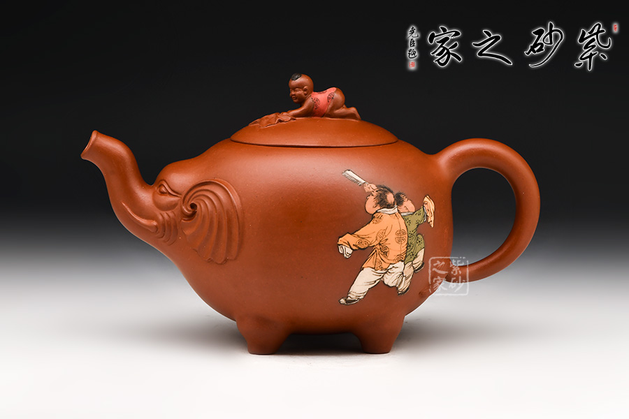 洗象壺將象形化為壺形,壺柄為象尾,壺流為象鼻,流旁塑象牙與蒲扇大耳,身軀豐碩,自成壺體,大象眼神溫和,四肢粗壯。壺鈕為一稚氣孩童,造型天真與壺體泥繪的兩小兒相應(yīng),三童子皆身著彩衣,執(zhí)著刷子和布巾,稚氣純和,洗象沖去灰塵。整器取材自然,返璞歸真!