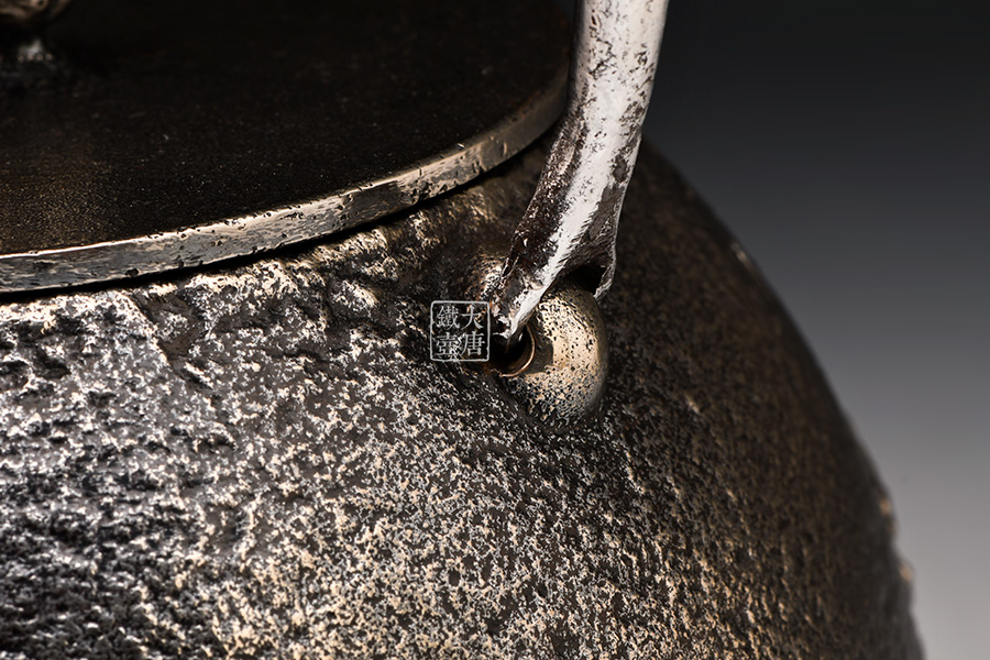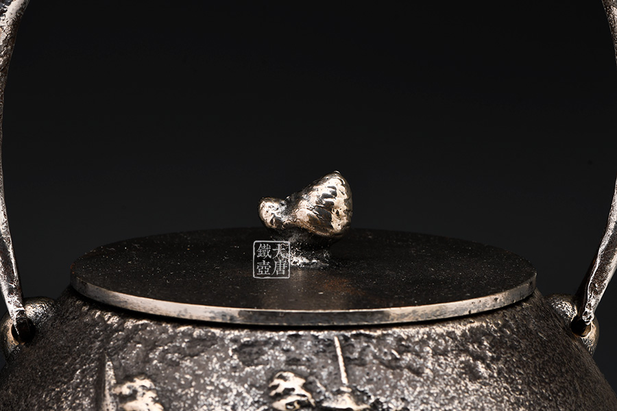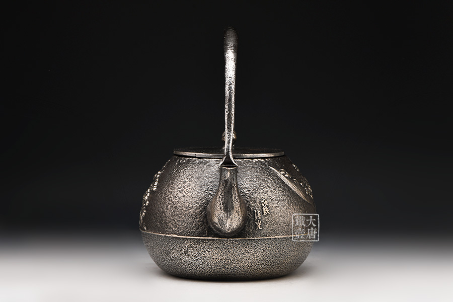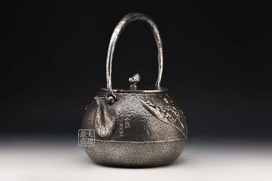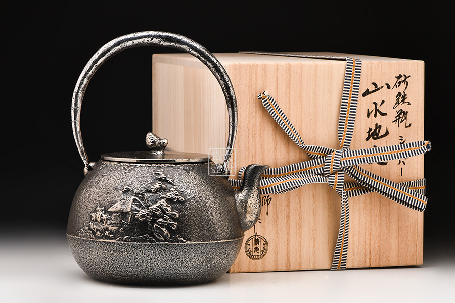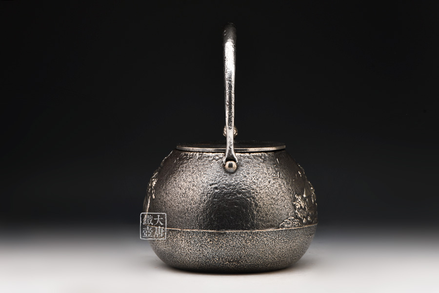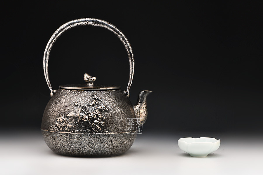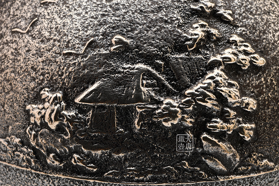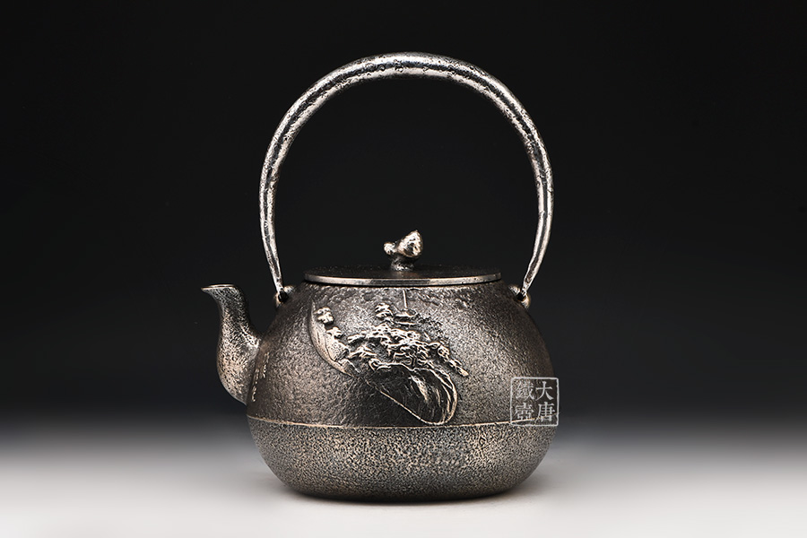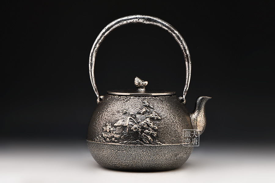 清光堂 山水地紋砂鐵壺(銀色,松子摘鈕) [ 編號:86100 ]