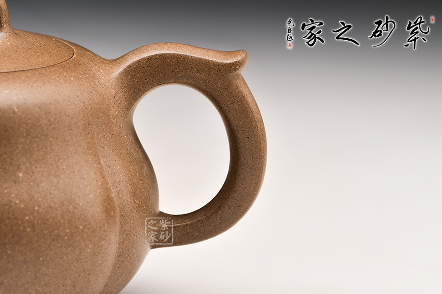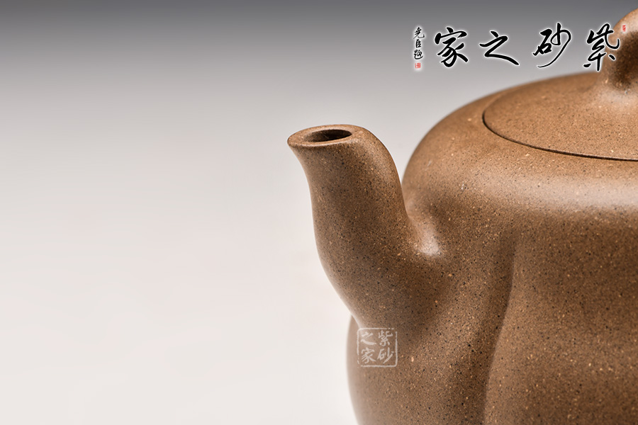 整器造型憨胖,敦實厚重,沉穩(wěn)有力,特別之處在于,壺身加以筋紋裝飾,動感十足。流與把舒暢自如,工藝精到,將富有的自然之美賦予紫砂之上,這是紫砂與自然的頌歌。