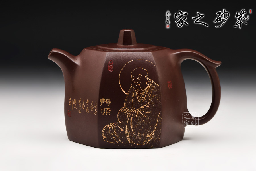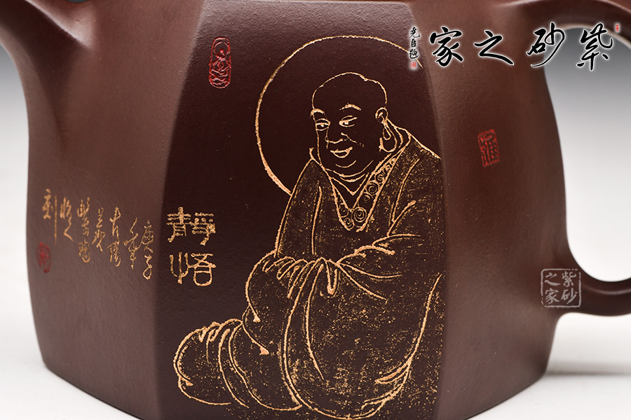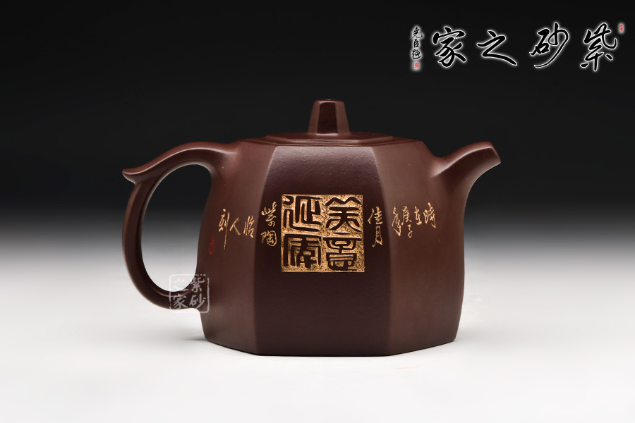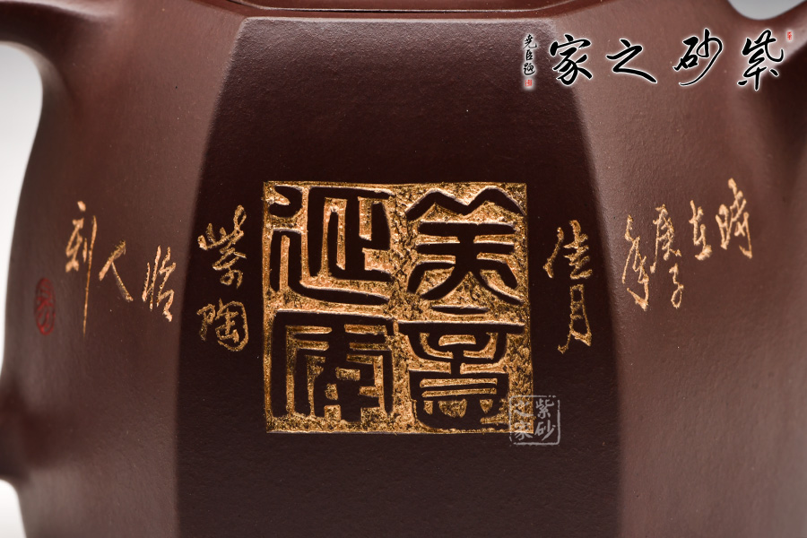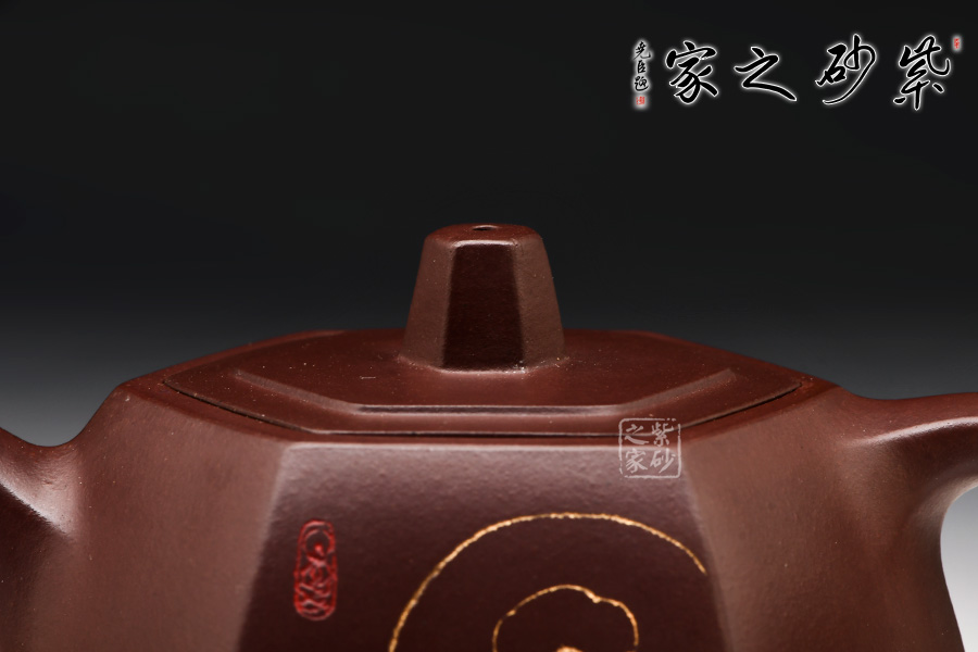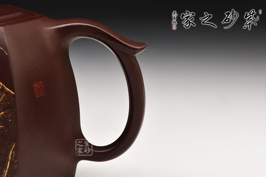 此壺在經(jīng)典漢鐸的基礎(chǔ)上加入了六方的型制,造型規(guī)整,壺身如鐘,氣勢(shì)浩然。平嵌蓋,與壺融為一體,柱形鈕,短彎流,耳形方把,形筒古樸,整器亦樸亦雅,亦古亦今,