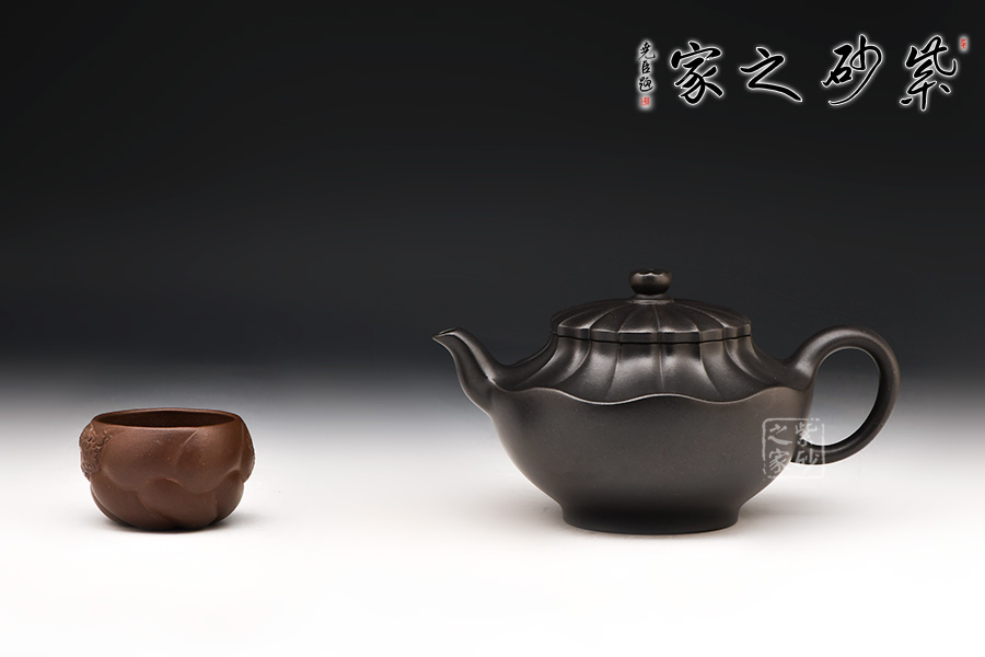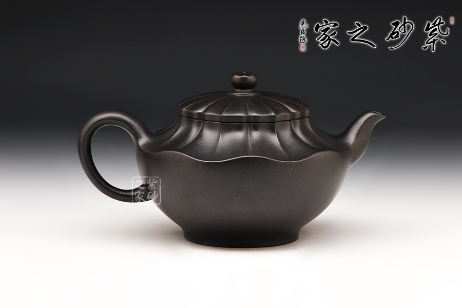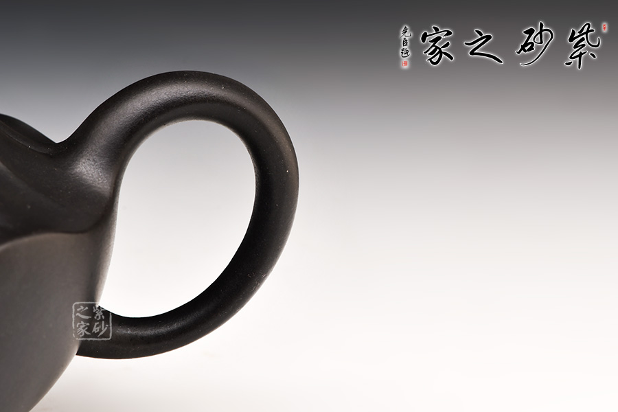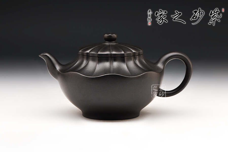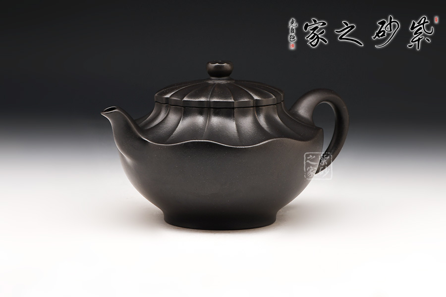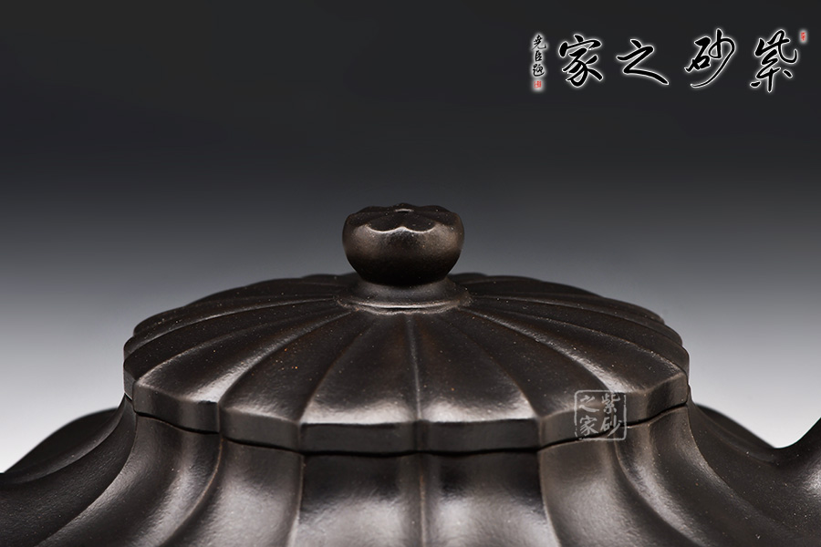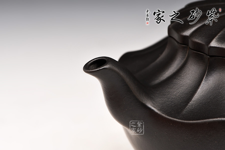 此壺身上部以蓮花瓣裝飾出筋紋肌理,紋理清晰明快,將蓮花的清逸之態(tài)完美展現(xiàn)。壺身下部收斂呈圈足底,與壺身上部形成涇渭分明而又氣韻和諧的效果。彎流、耳把、花鈕等各部位比例協(xié)調(diào),制作嚴(yán)謹(jǐn),展示了作者一絲不茍的制壺態(tài)度。