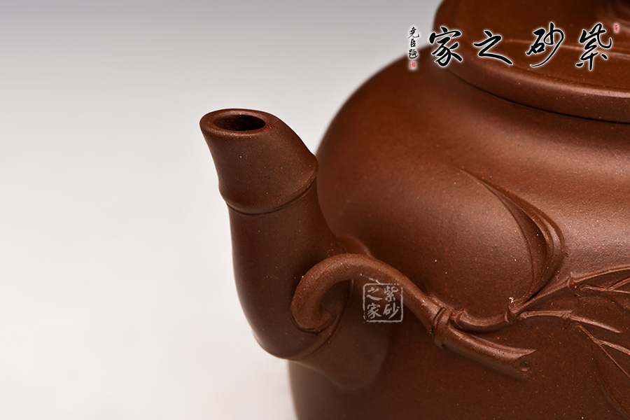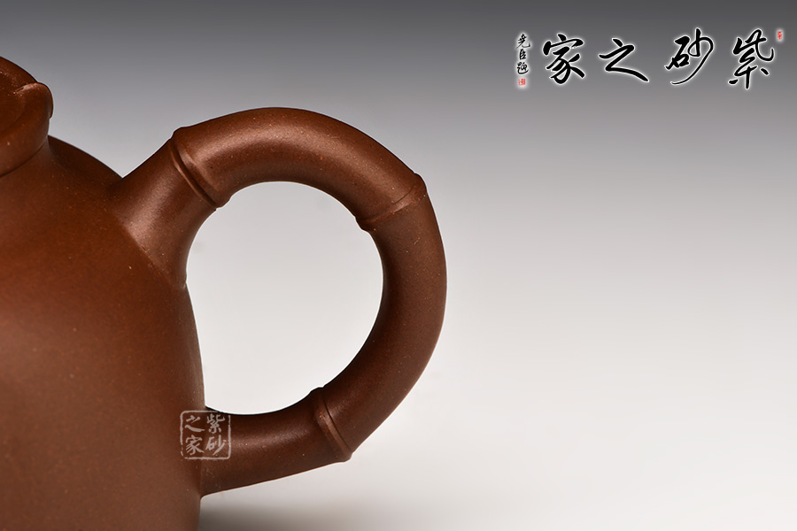 正觀此壺,靜謐中藏有動勢。壺身為半圓竹段,打造出生趣盎然的藝術(shù)境界。竹節(jié)曲度協(xié)調(diào)得體,盡顯天然本色。壺把、壺流及蓋鈕皆竹節(jié)之貌,渾若天成,寫實(shí)自然,極為肖似。
