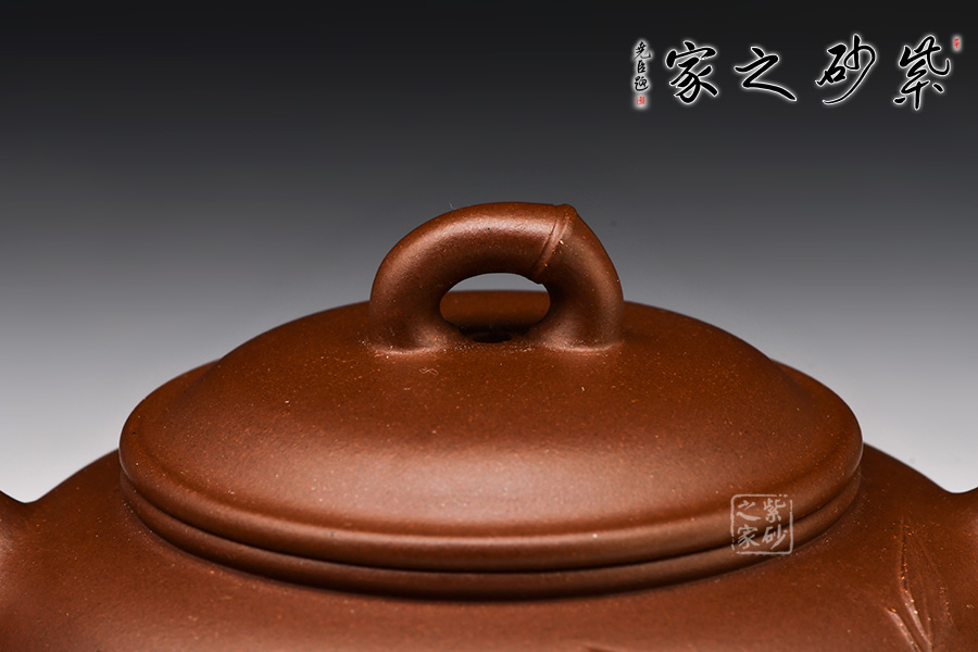 正觀此壺,靜謐中藏有動(dòng)勢(shì)。壺身為扁圓竹段,打造出生趣盎然的藝術(shù)境界。竹節(jié)曲度協(xié)調(diào)得體,盡顯天然本色。壺把、壺流及蓋鈕皆竹節(jié)之貌,渾若天成,寫(xiě)實(shí)自然,極為肖似。