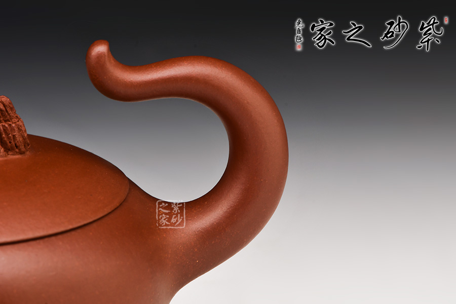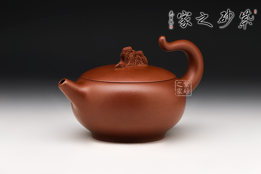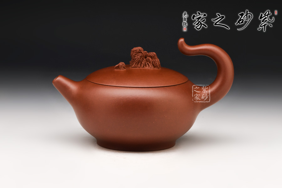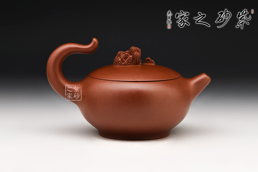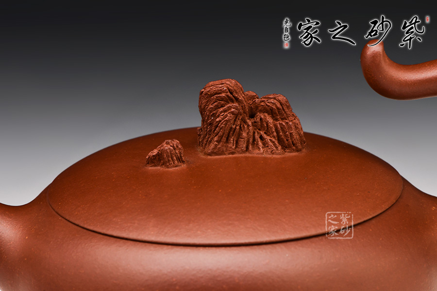 此作以嵩山為靈感,造型新穎,意味超凡。壺身扁圓,坐穩(wěn)如山,氣勢不凡,美觀自然,壺鈕尤為別致,為山一座。壺把飛揚,設(shè)計精巧,與整器協(xié)調(diào)呼應(yīng),是一把難得的創(chuàng)新佳器,賞用皆宜。