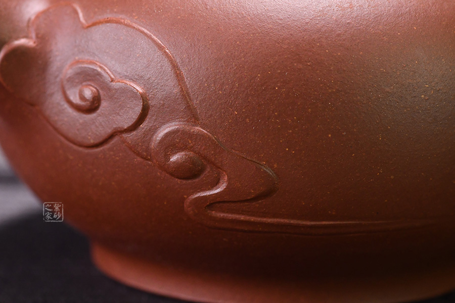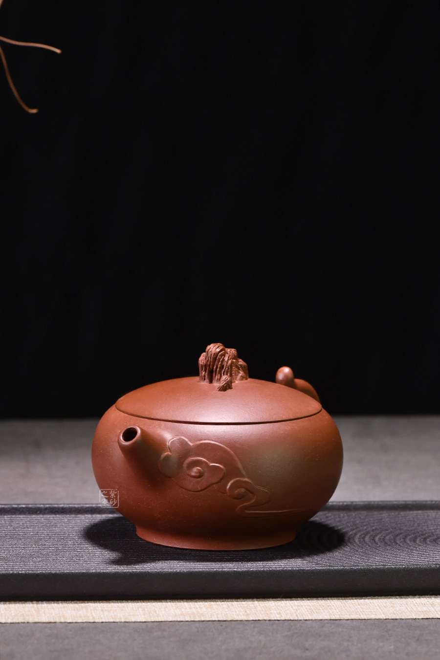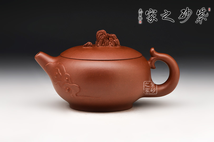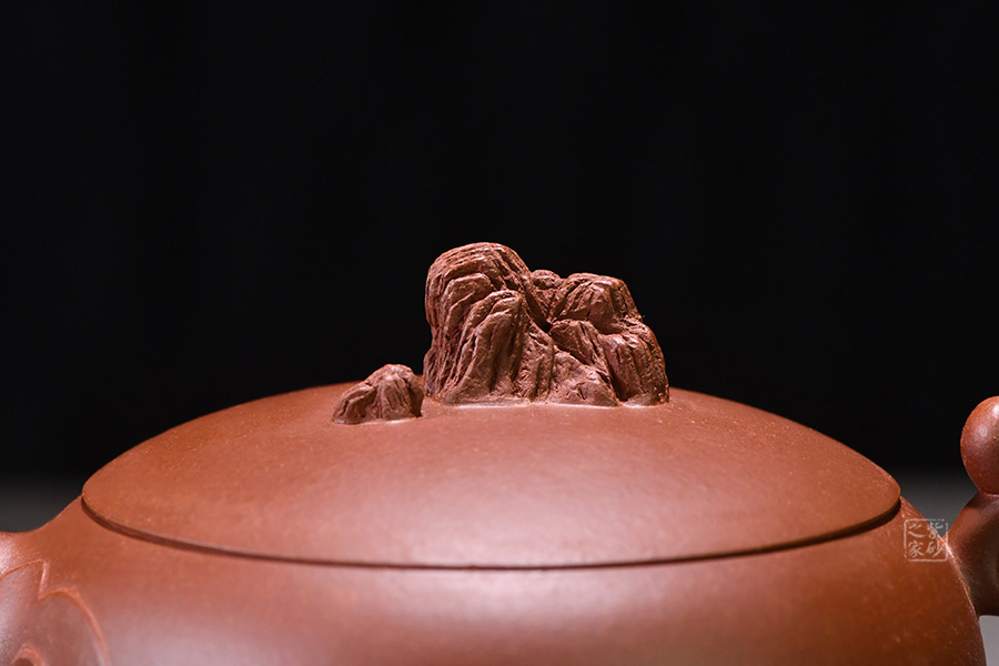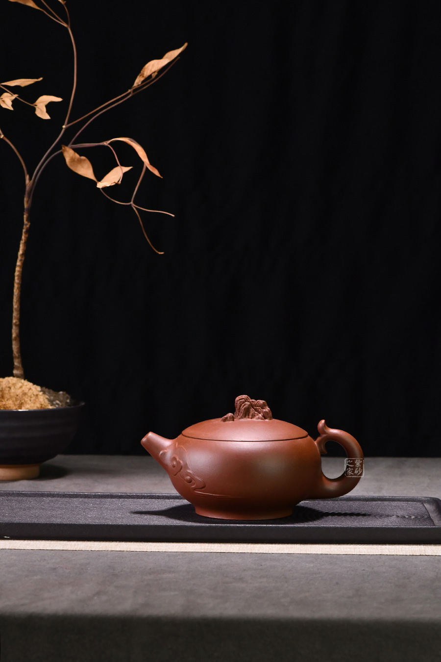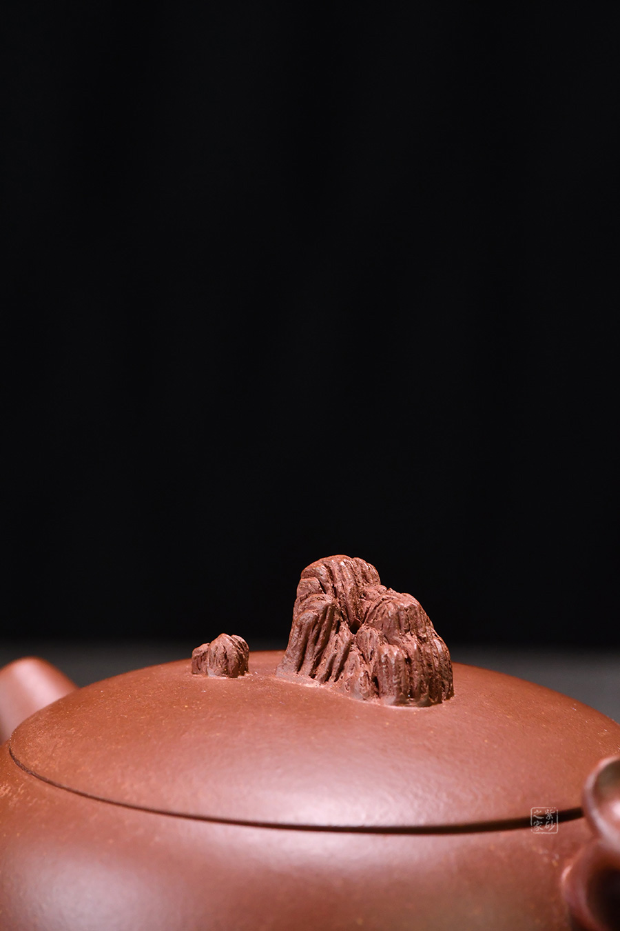 此作以嵩山為靈感,造型新穎,意味超凡。壺身扁圓,坐穩(wěn)如山,其上祥云裝飾,氣勢不凡,壺鈕尤為別致,為山一座。壺把飛揚,設(shè)計精巧,與整器協(xié)調(diào)呼應(yīng),是一把難得的創(chuàng)新佳器,賞用皆宜。