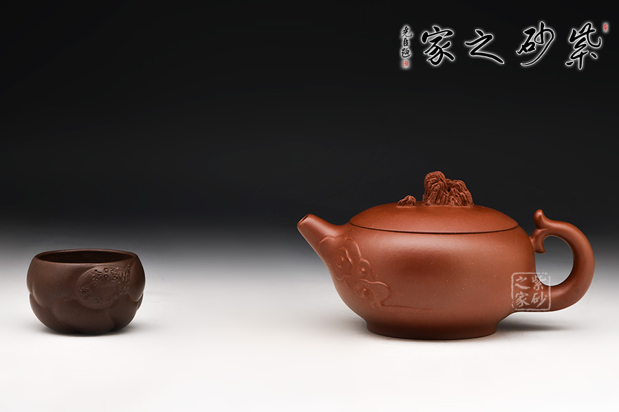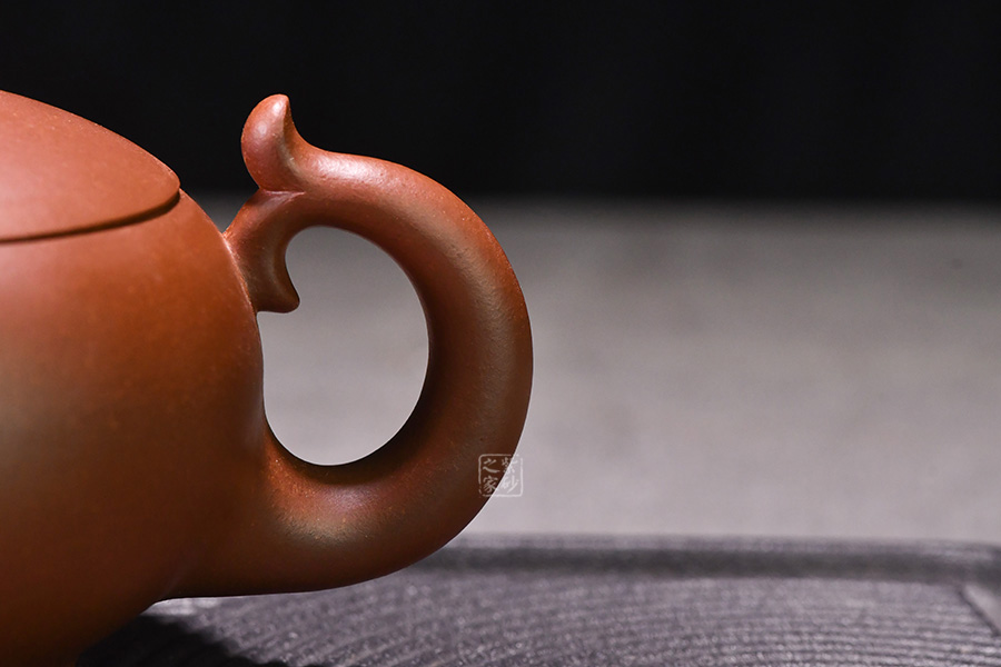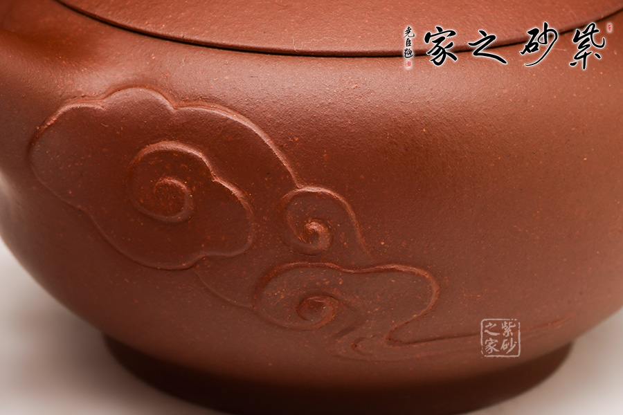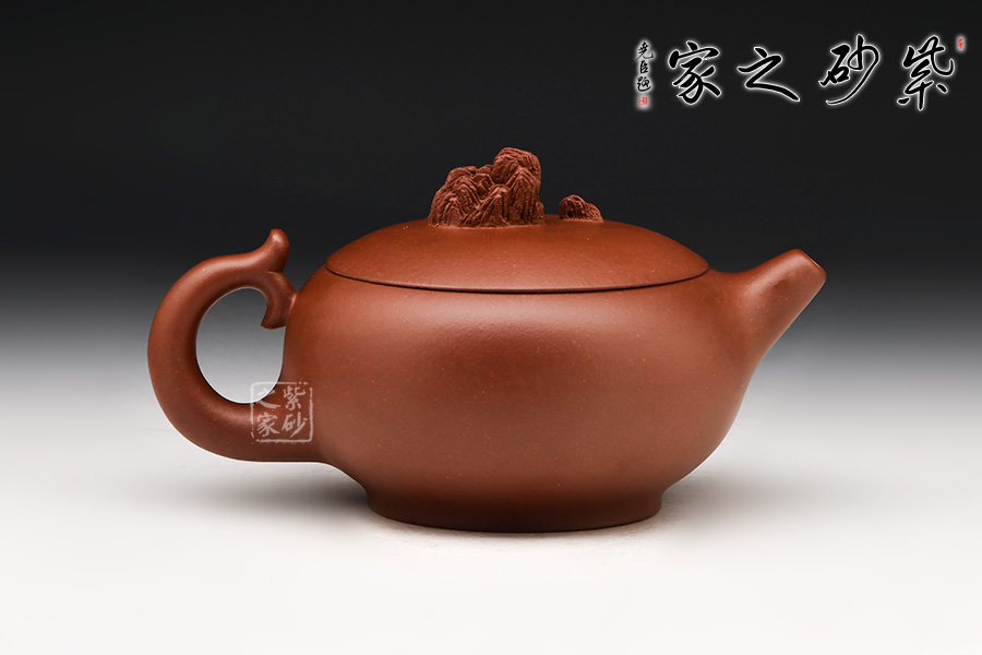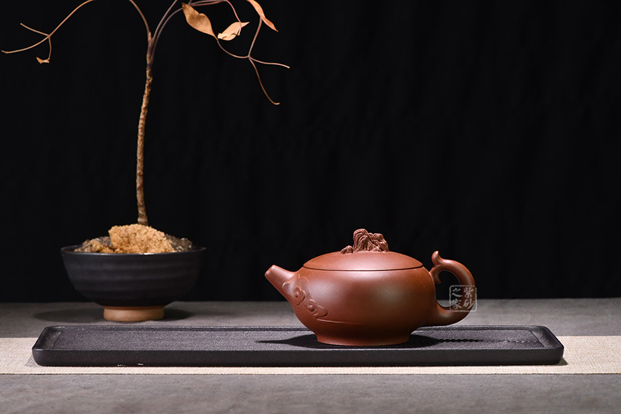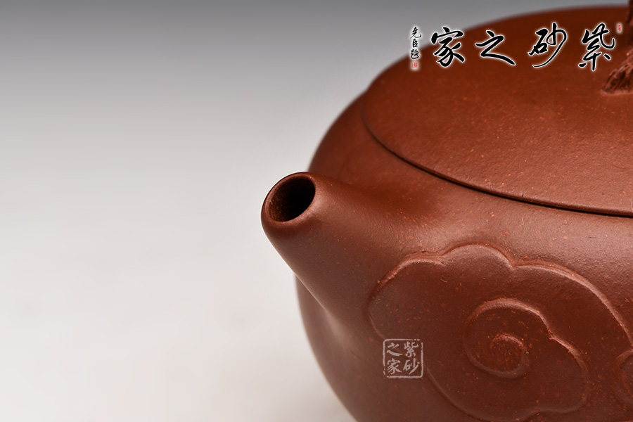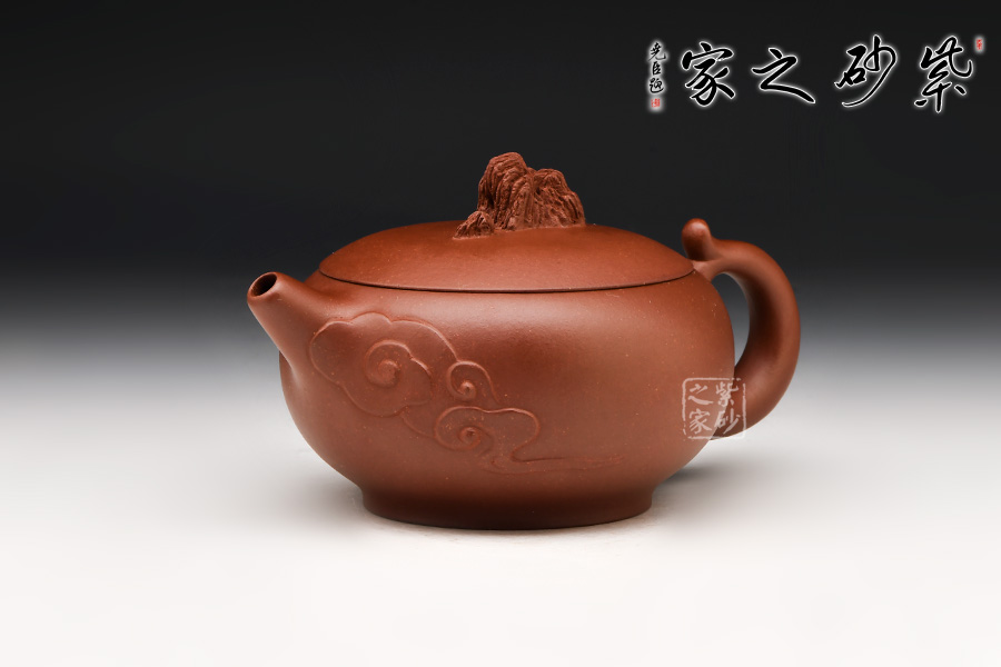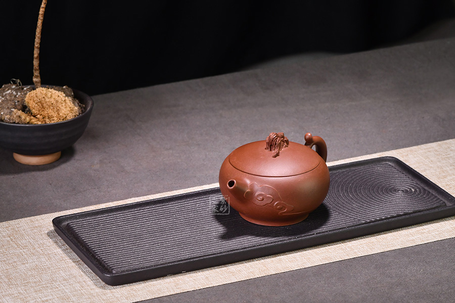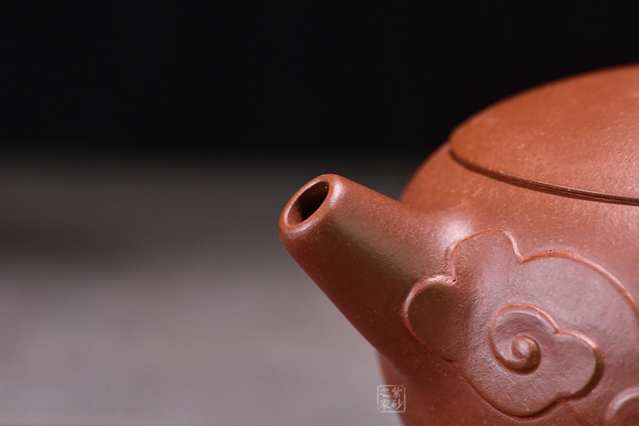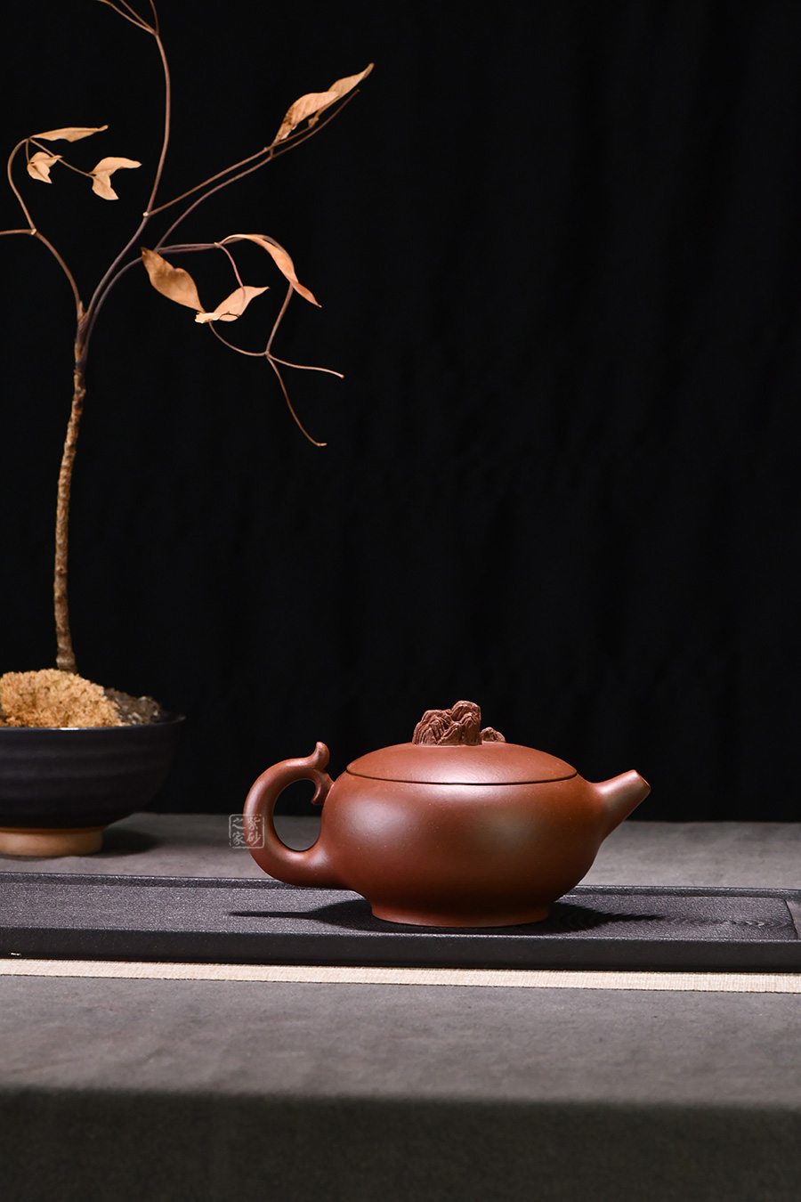 此作以嵩山為靈感,造型新穎,意味超凡。壺身扁圓,坐穩(wěn)如山,其上祥云裝飾,氣勢不凡,壺鈕尤為別致,為山一座。壺把飛揚,設(shè)計精巧,與整器協(xié)調(diào)呼應(yīng),是一把難得的創(chuàng)新佳器,賞用皆宜。